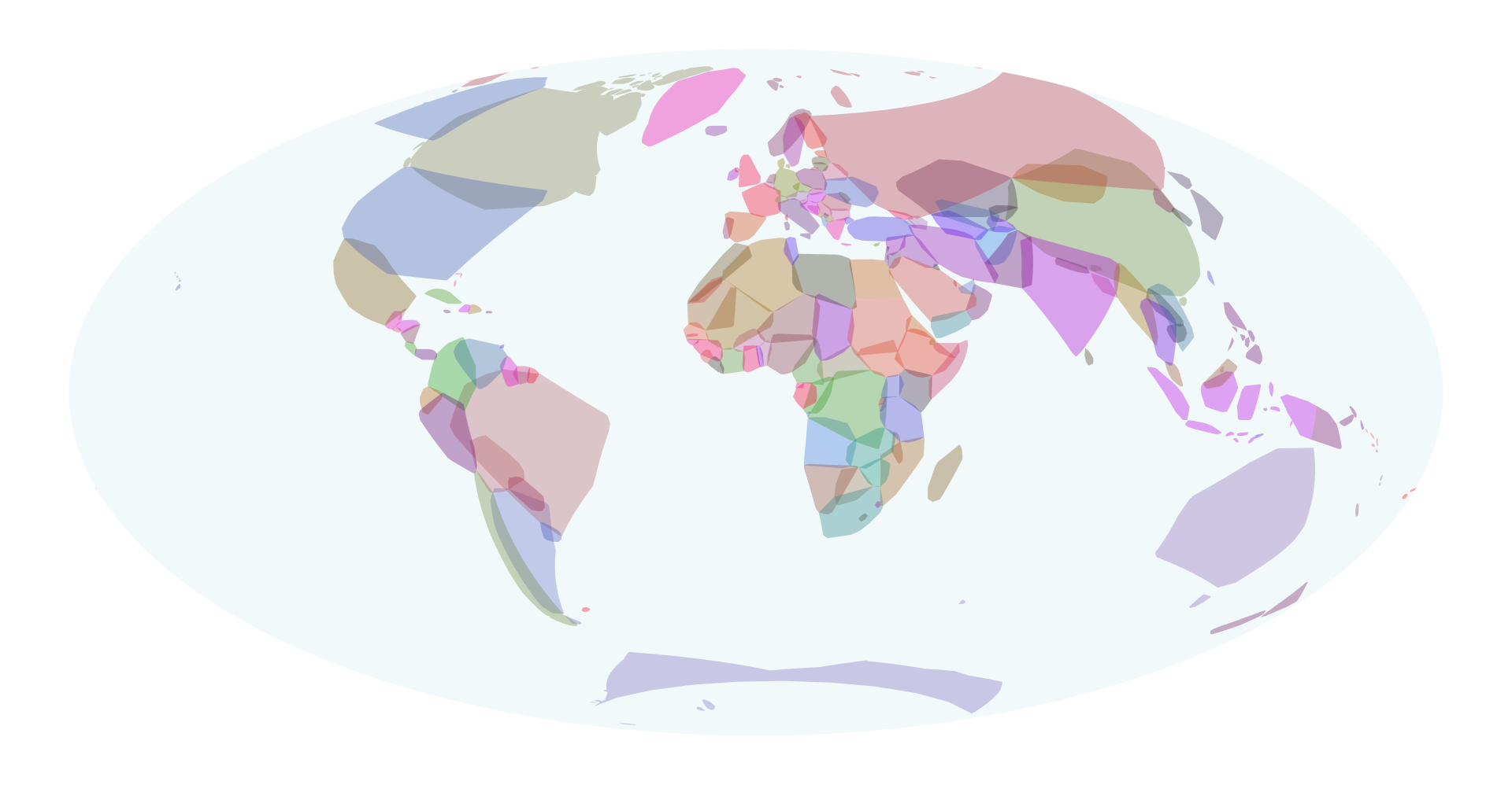 st_transform("+proj=hammer")The map itself is simple. I decided to colour by country, not by continent.
