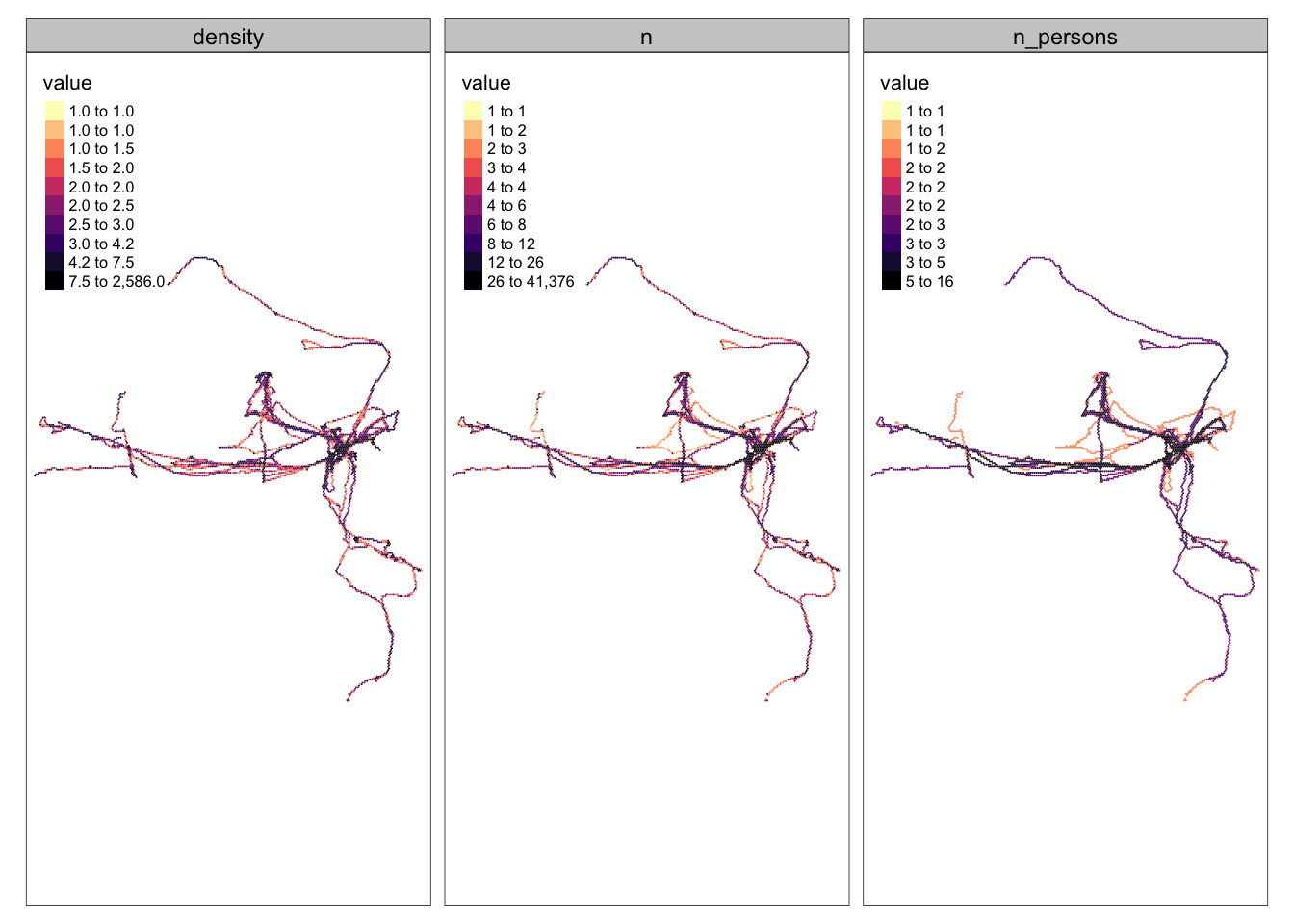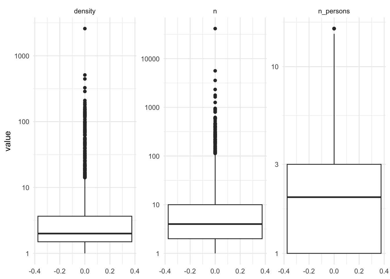 tm_facets(by = "name", free.scales = TRUE)But where to cut off the data? Here are boxplots (note log scales) of the number of fixes n, the number of persons, n_persons, and the number of fixes per person, density, associated with each hex.
