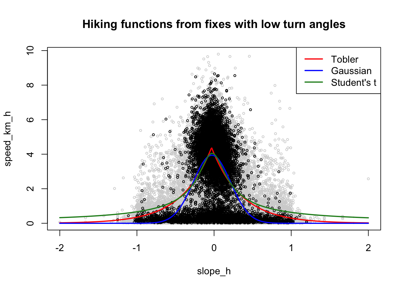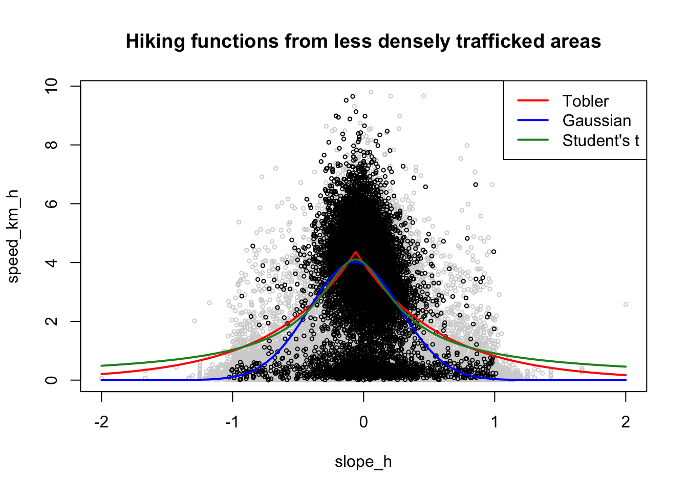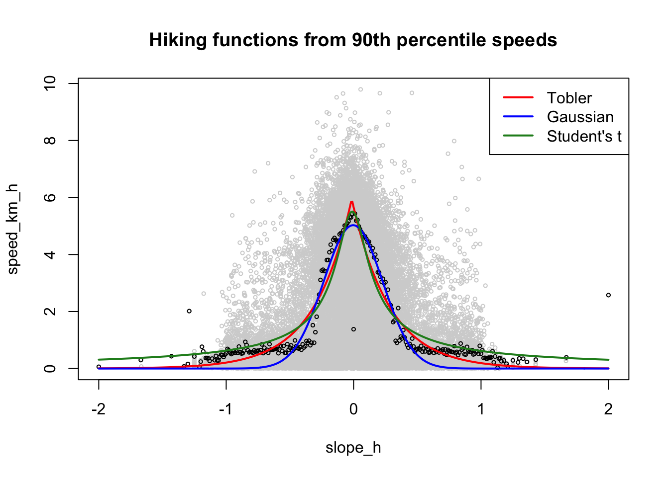 col = c("red", "blue", "forestgreen"), lwd = 2, lty = 1)Based on residual sum-of-squares, the Tobler-like function is the best fit in this case (although the differences are small). In this particular case, the paramterisation is strikingly similar to Tobler’s