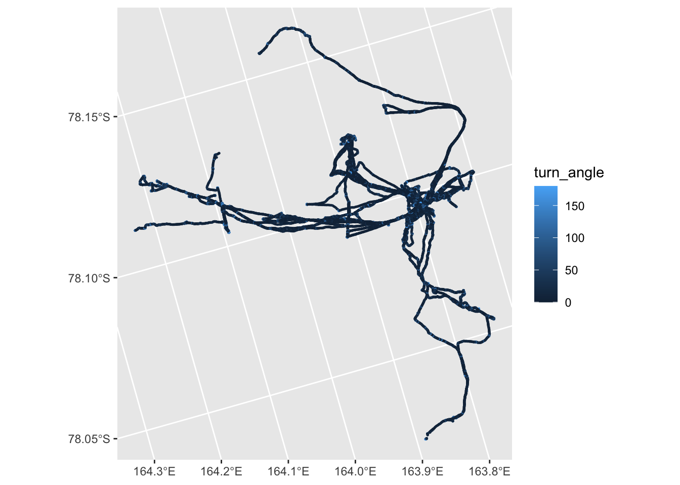 Again, this is a way to potentially remove data where there is a lot of milling about. As with the density approach, it’s hard to know what is a sensible cutoff. A map of the fixes coloured by turn angle is not necessarily much help: