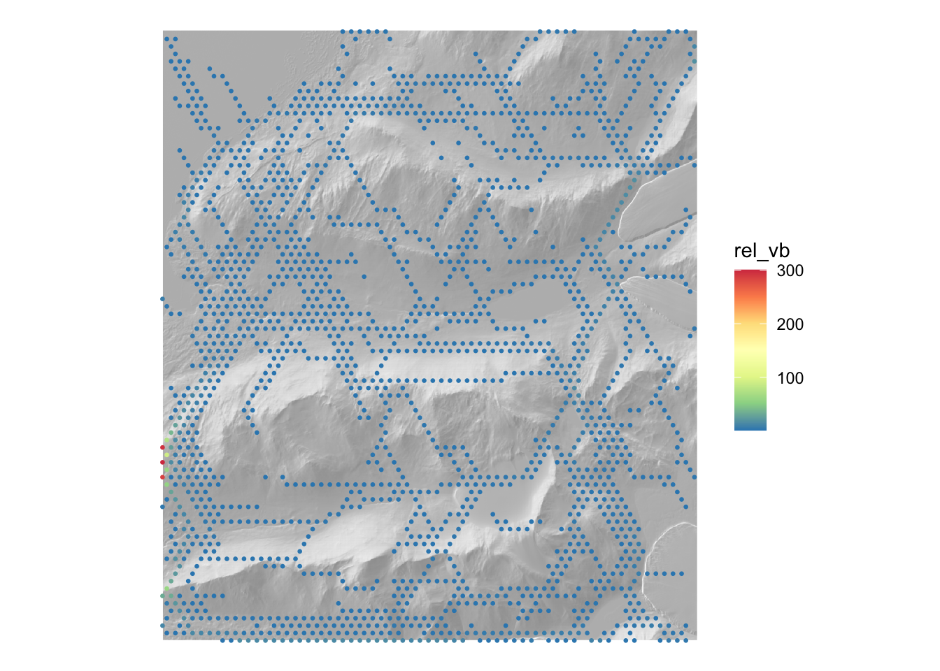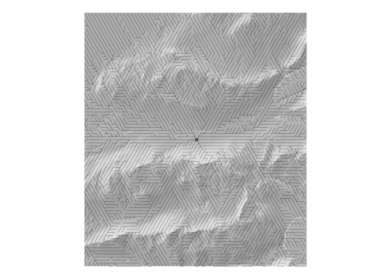 The hillshade basemap highlights how the total shortest path prioritises paths that follow contours since the lowest cost way in general to get to a particular vertex is from a neighbouring vertex at similar elevation.