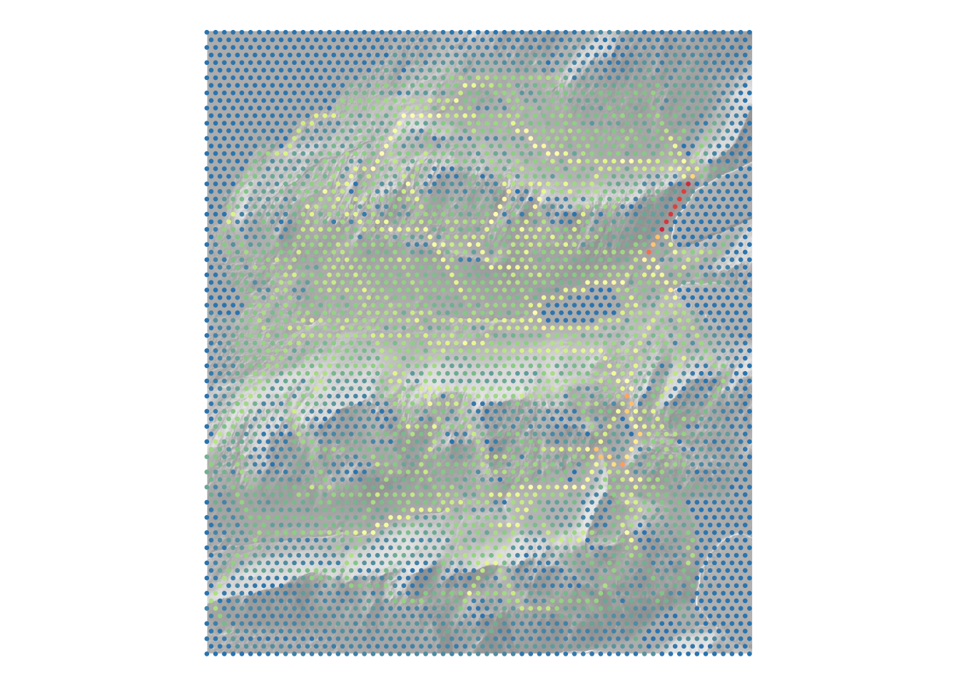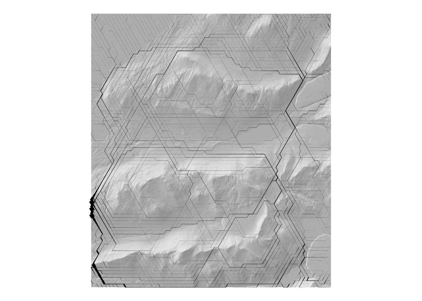 # make a hillshade 'basemap'hillshade_basemap <-ggplot() +geom_raster(data = shade |>as.data.frame(xy =TRUE), aes(x = x, y = y, fill = hillshade), alpha =0.5) +scale_fill_distiller(palette ="Greys", direction =1) +guides(fill ="none") +theme_void()hillshade_basemap +geom_sf(data = G |>get_graph_as_line_layer(), aes(colour = cost), linewidth =0.1) +scale_colour_distiller(palette ="Spectral") +theme_void()