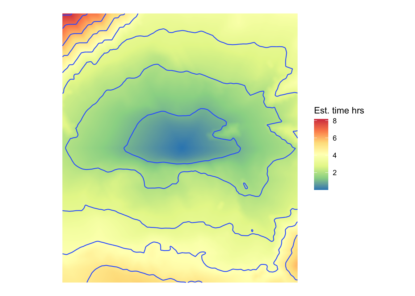 rast(tif_fname) |>as.data.frame(xy =TRUE) |>ggplot(aes(x = x, y = y)) +geom_raster(aes(fill = travel_time)) +scale_fill_distiller(palette ="Spectral", name ="Est. time hrs") +geom_contour(aes(z = travel_time), linewidth =0.5) +coord_equal() +theme_void()