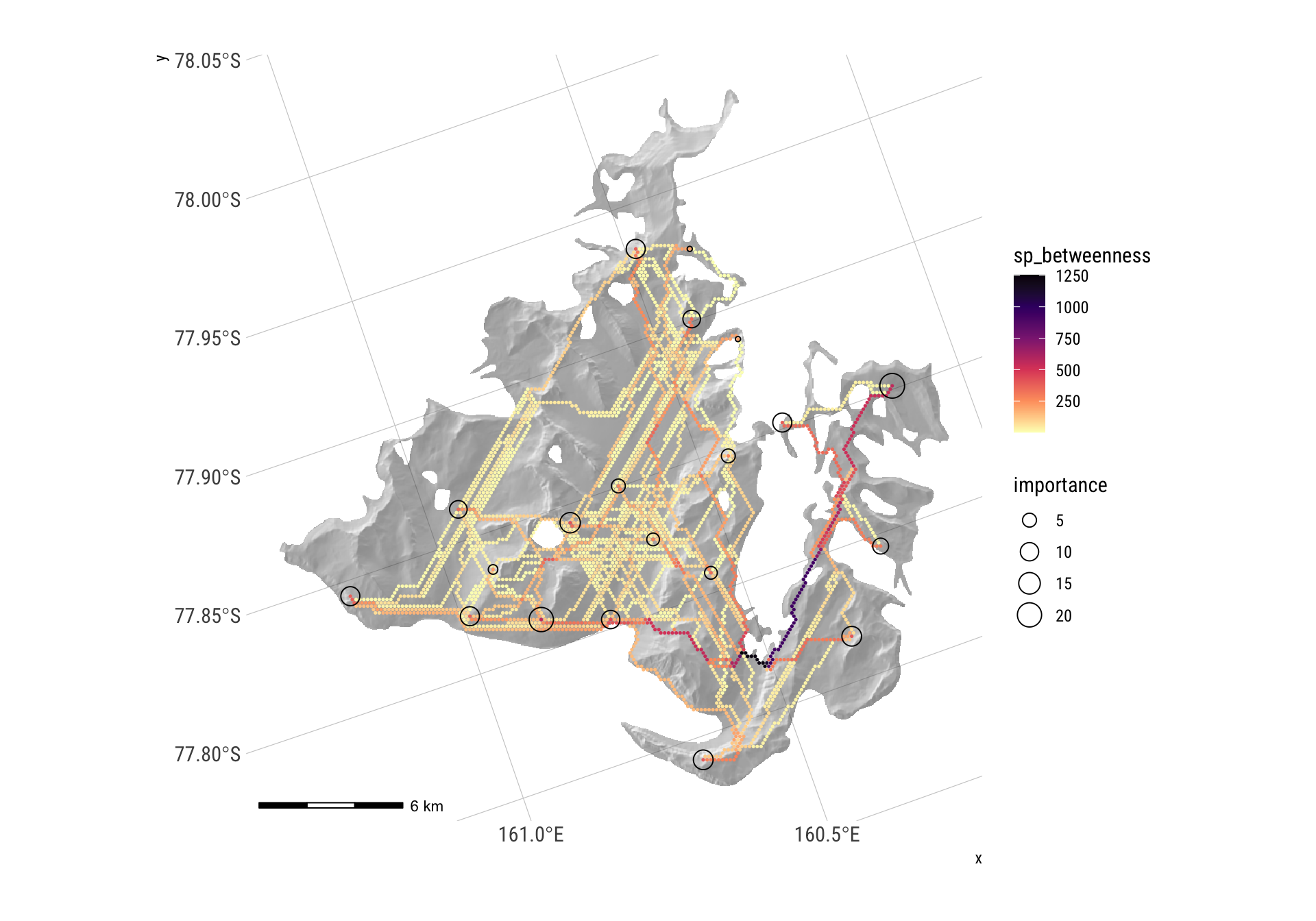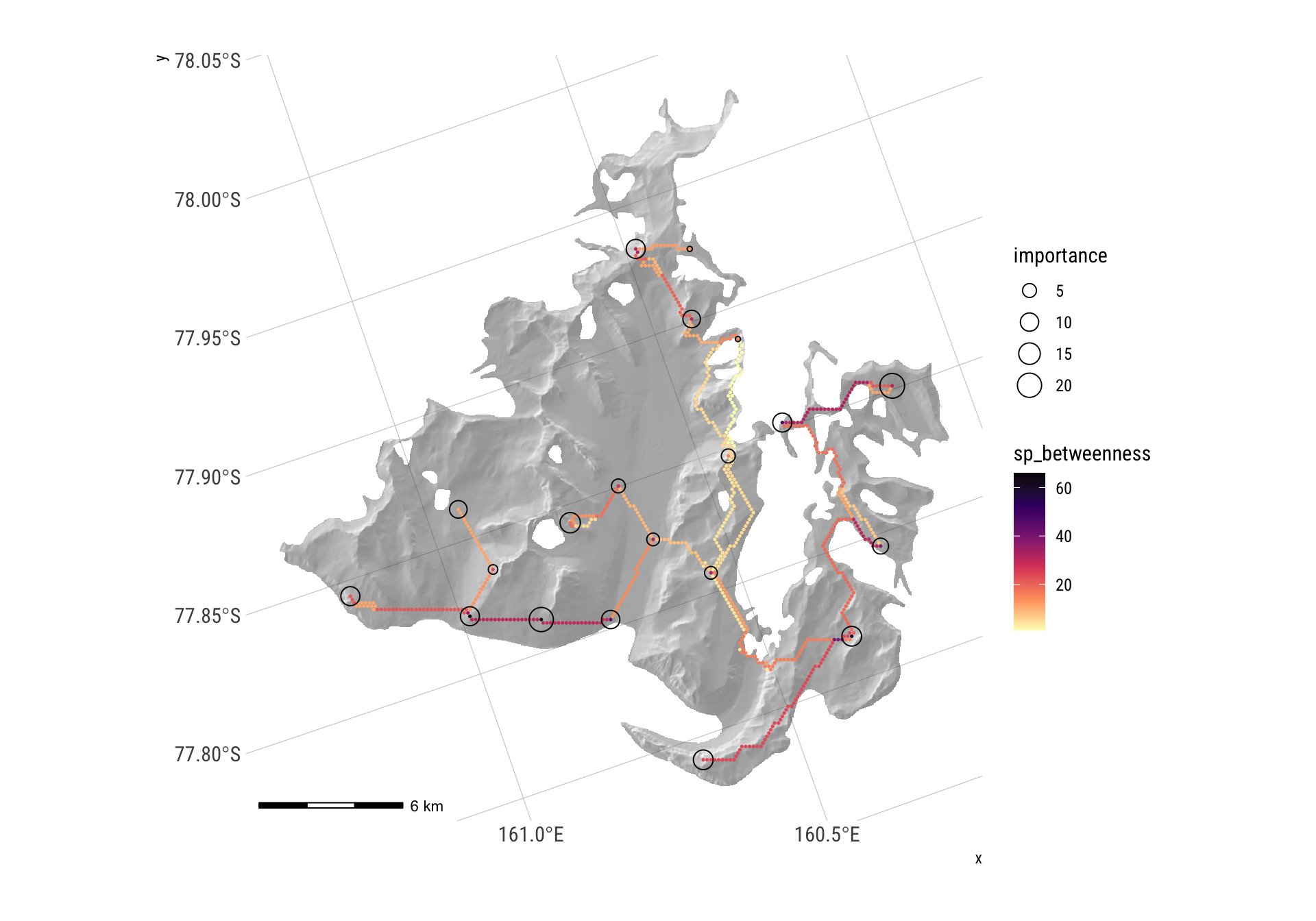 G <- G |> set_vertex_attr("sp_betweenness", value = result$betweenness)igraph makes this choice). Note that unless two paths are exactly the same total cost then the much slower unused version of the code will still, in effect, pick the shorter path, when in fact ‘on the ground’ either might be just as likely to be selected. First up, we use it calculate all sites to all sites shortest paths and overlay those.# put all vertices on a shortest path to begin