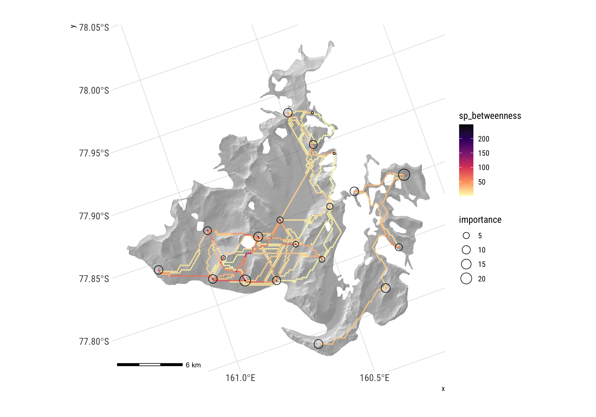This notebook explores developing the betweenness centrality networks/risk maps based on a known set of most often used origins and destinations. The idea would be to supply a list of locations with associated weightings, where for example base camp might be (say) 25, some once-visited sampling locations might be ‘1’, repeat-visit experimental sites might be 5. Betweenness is then based on all shortest paths among these sites weighted by those numbers.