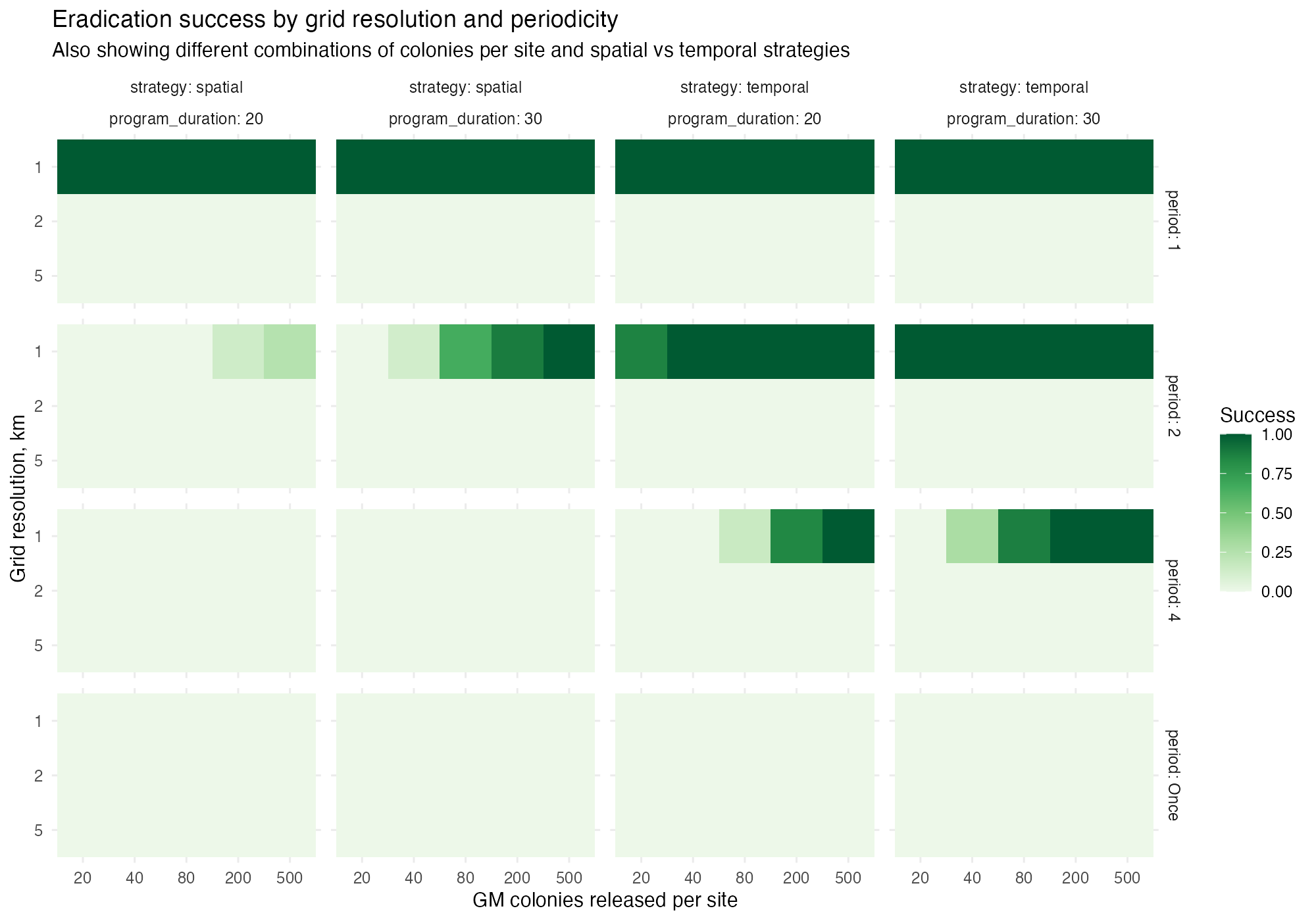 where only very high intensity releases of GM wasps over many years are successful in eradicating wild wasps. This is Figure 5 from the paper explaining the inner workings and conclusions from the model: