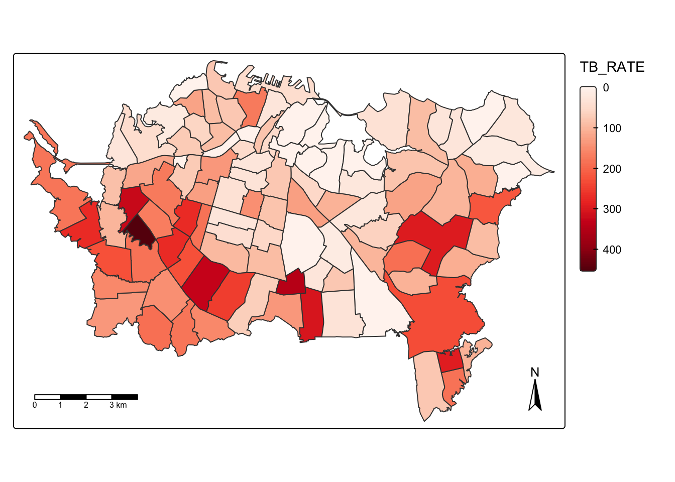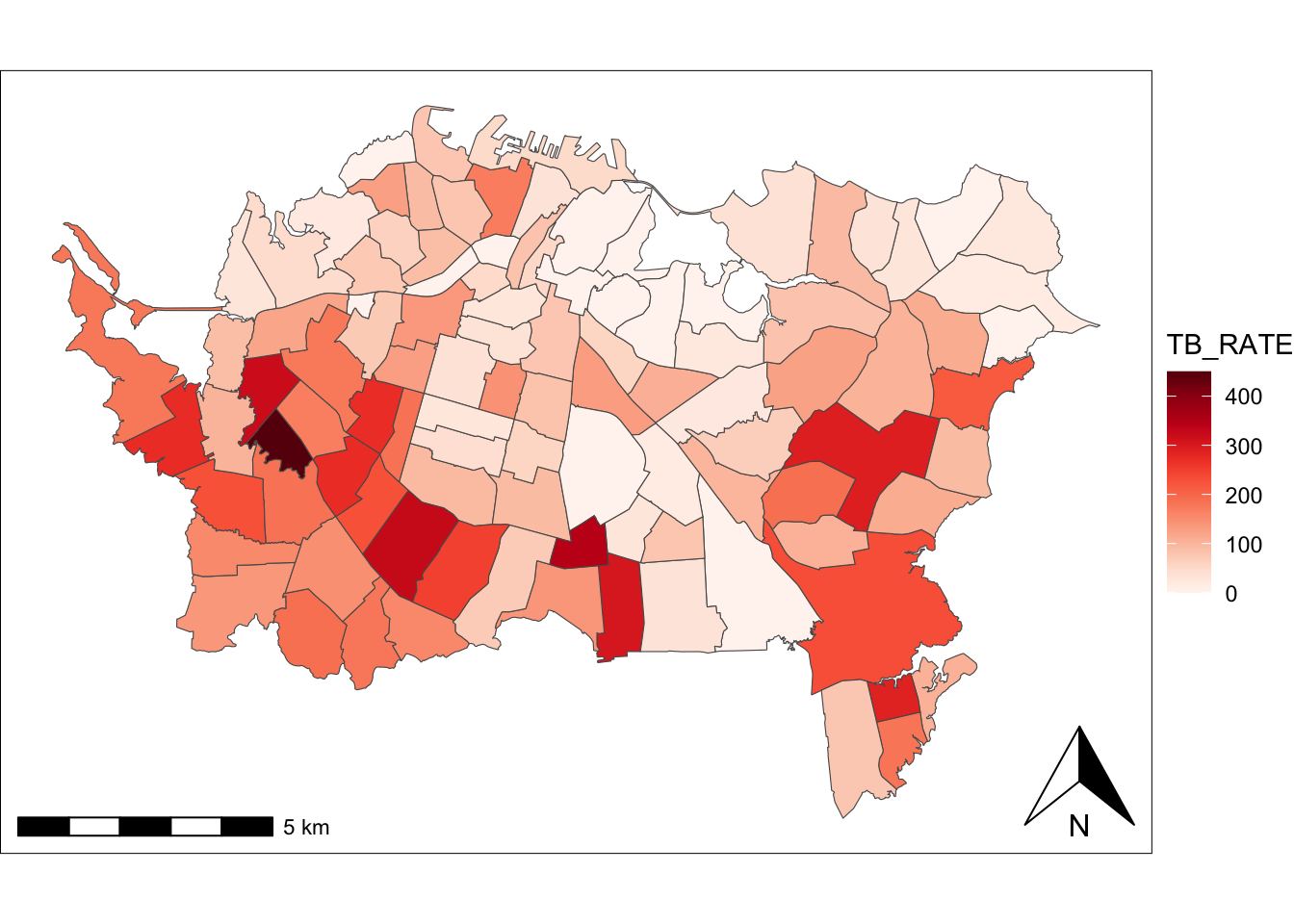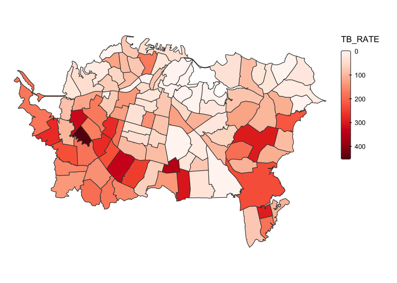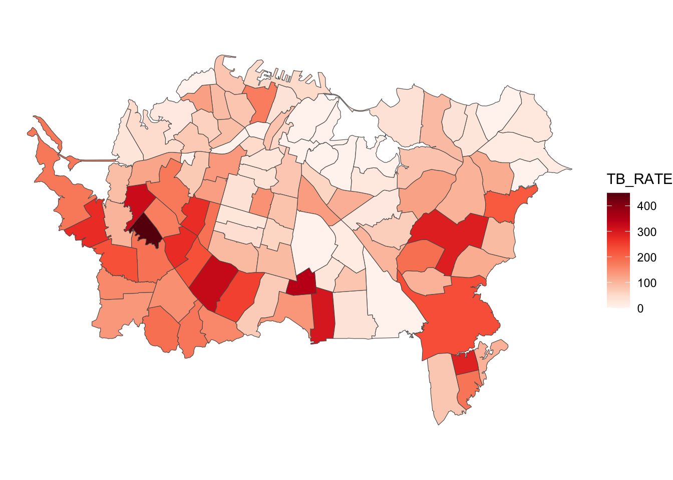 And here’s the most basic ggplot2 choropleth map of the TB_RATE variable (which is cases per 100,000 population):