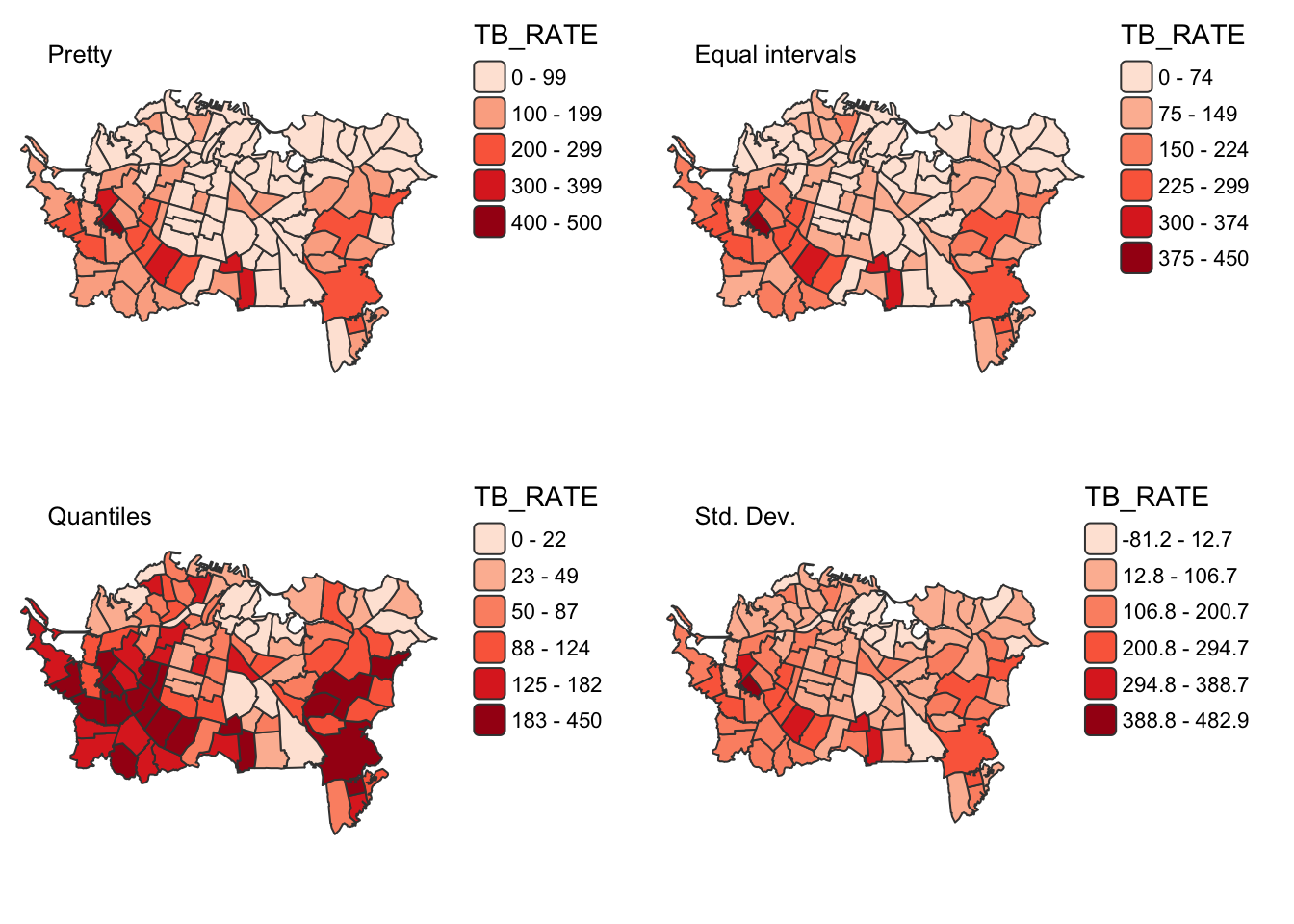 Where tmap wins out is if you want to experiment with classic choropleth map classification schemes, for example: