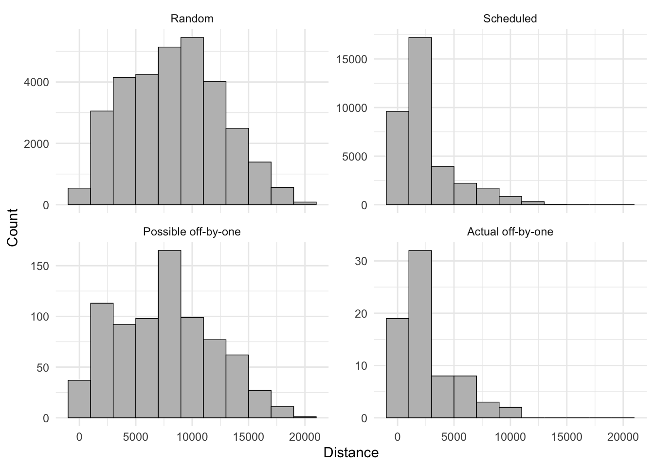 It’s not easy to know exactly how to approach this question. But we might expect, due to geographical patterns in naming and language, that there would be some clustering of the actual off-by-one routes. A rough and ready approach to testing this idea is applied in the code cell below, based on the lengths in km of the various subsets of flights. The idea is that shorter length routes might be more common among off-by-one routes than in scheduled flights in general.
