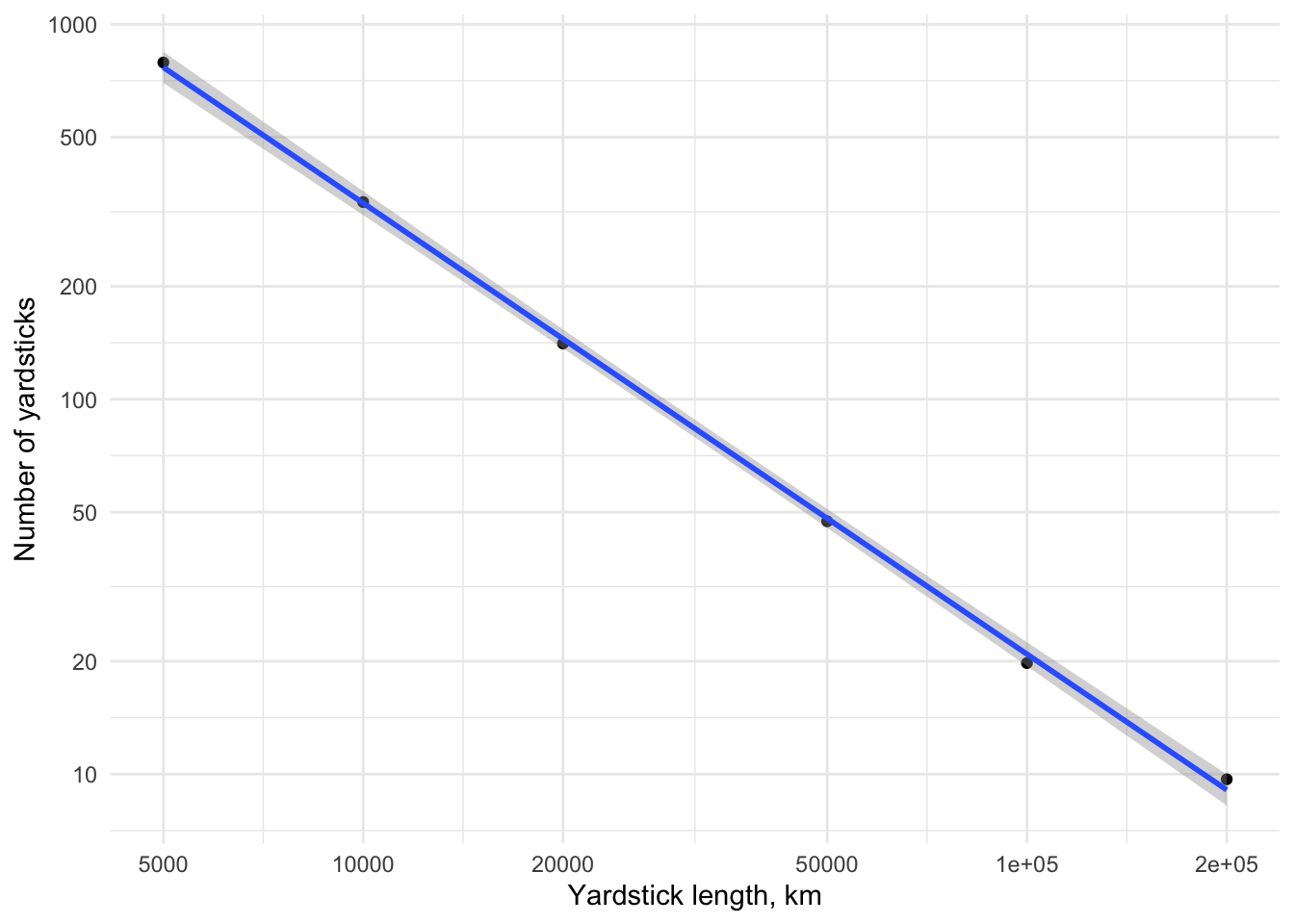 theme_minimal()This method makes me think that perhaps one way to go here might be counting discrete global grid cells along a line at a series of resolutions, although discrete global grid cells are not strictly equal in size and that might offend purists. A very cursory search suggests I am not the first person to think of this. If you are interested, see this paper: