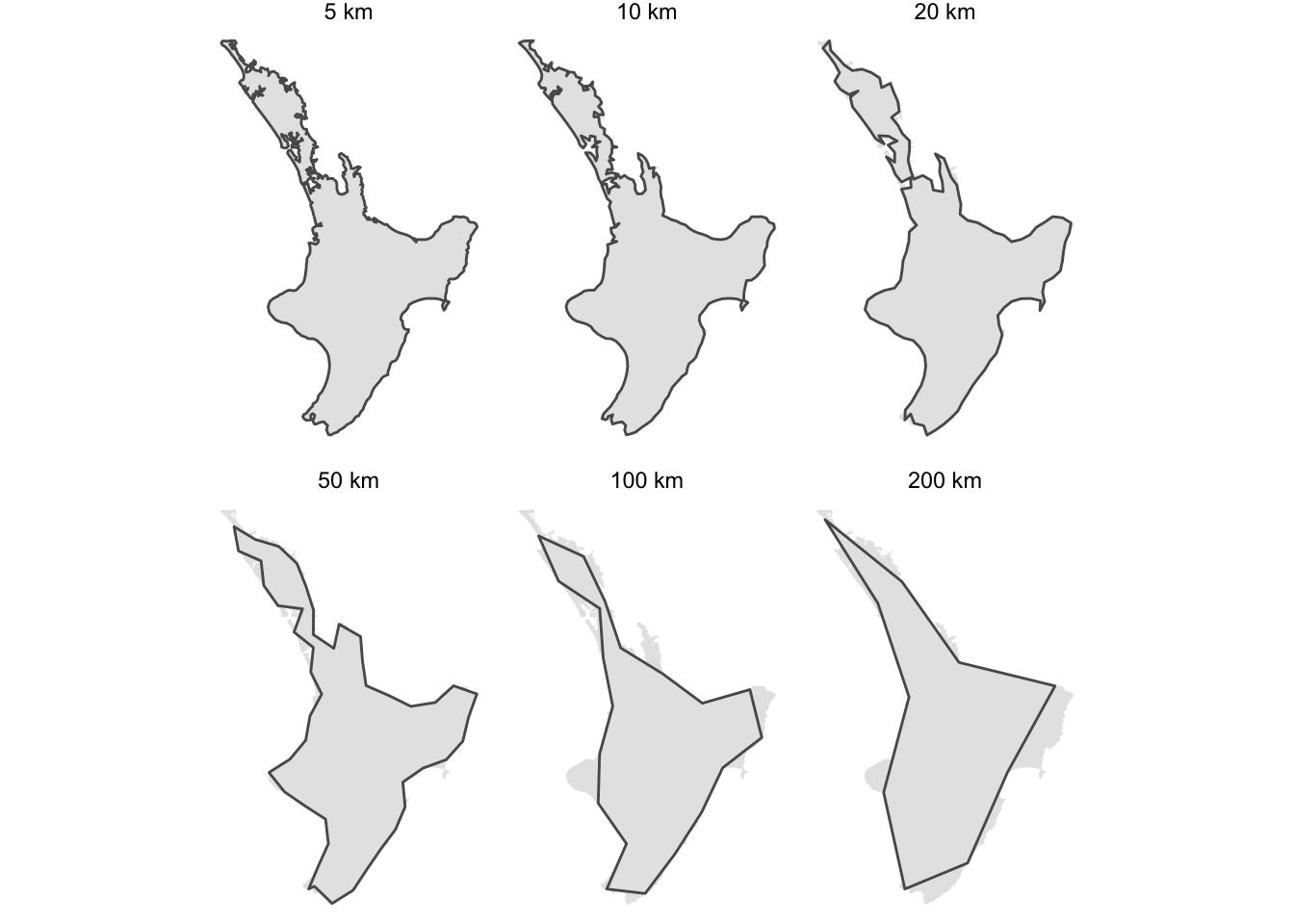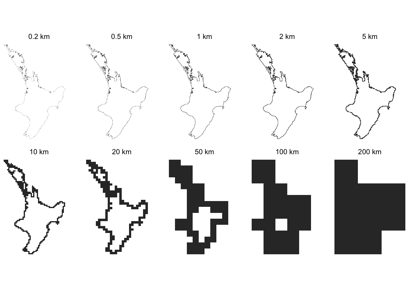 Note that because this method is much faster,5 we can extend the range of resolutions used to a lower value of only 200m without difficulty (lower still would be fine too, although you would then struggle to see the resulting rasterized maps of the coastline at all).