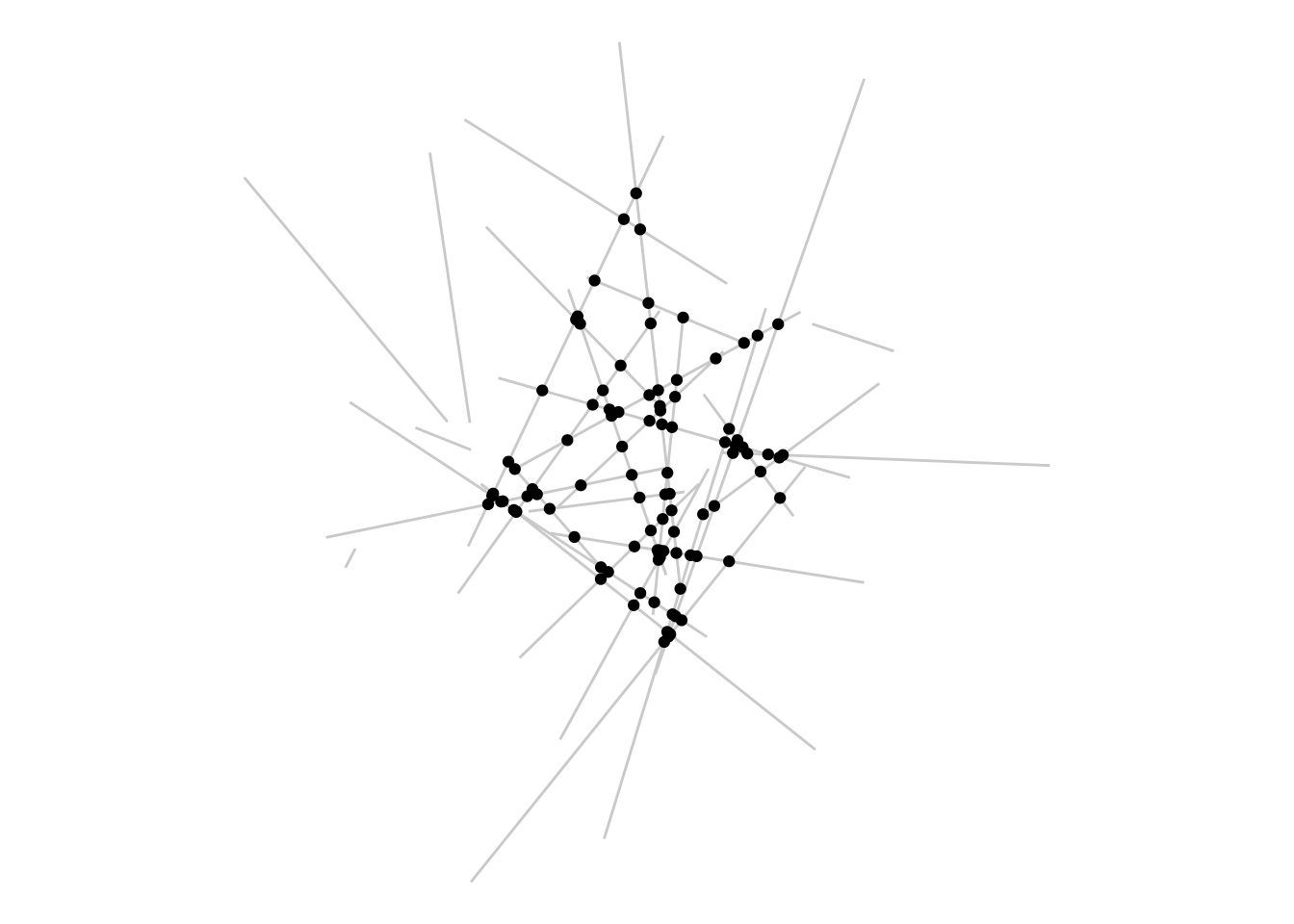 Our oracular table demands that we make points from lines by intersection. We already know that all the lines in our network intersect at nodes, so it makes more sense to generate the points of intersection of our random arrangement of lines.