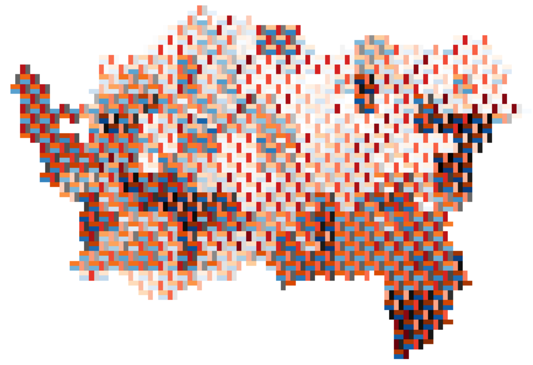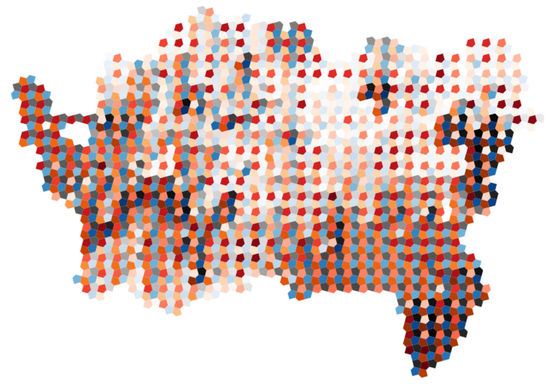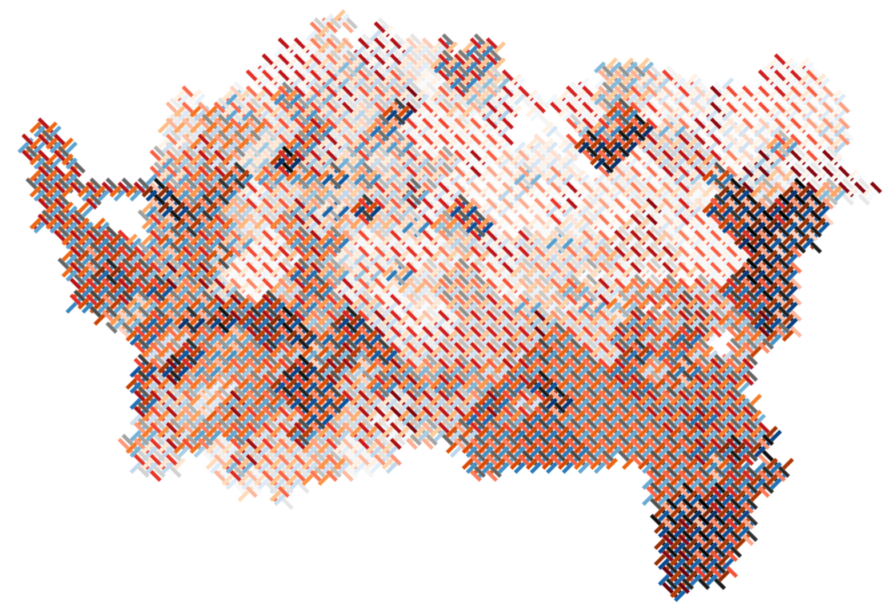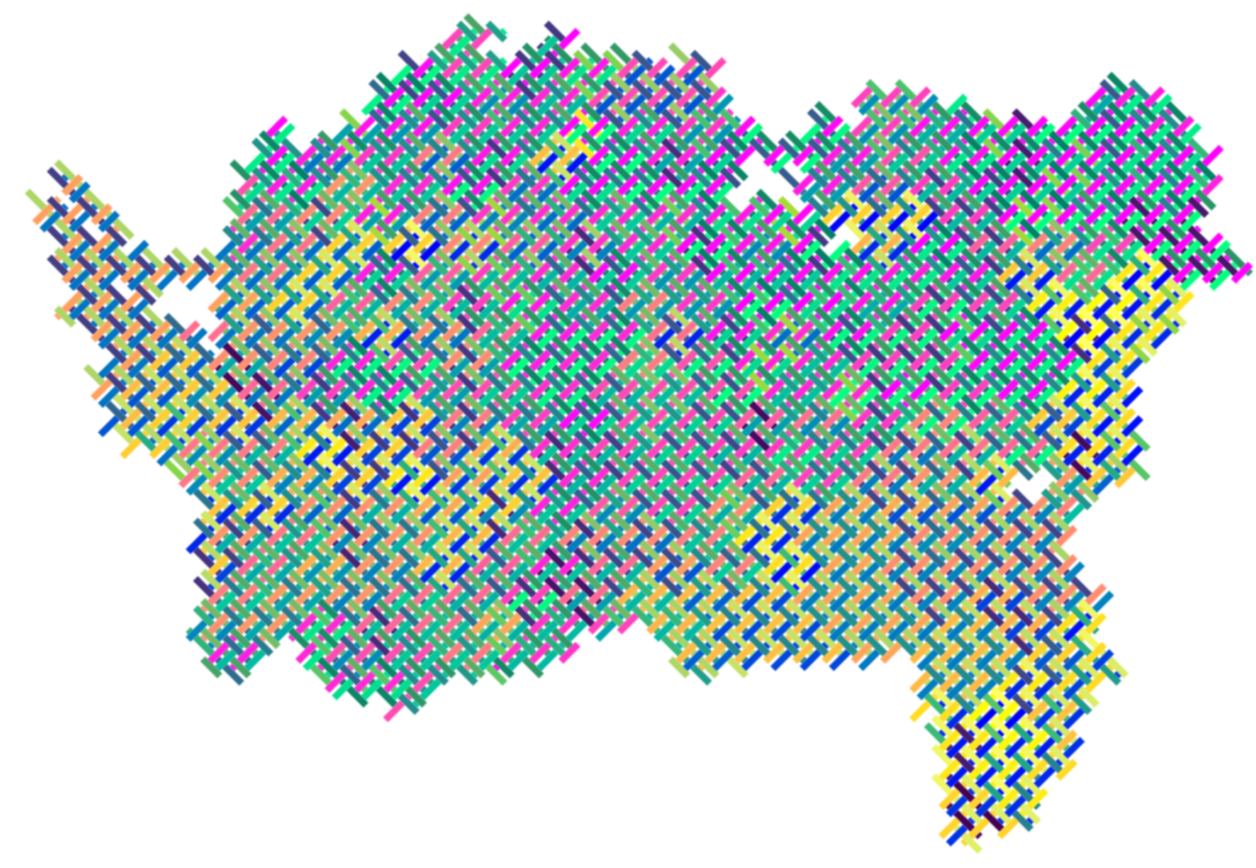 If you’ve seen me or my co-conspirator Luke Bergmann present at a cartographic meeting recently, there’s a fair chance you’ve heard us talk about using tiling and/or weaving to make maps of complex multivariate data.1 The idea is to break up map areas into multiple units by tiling so that we have available more than one shape to colour choropleth-style so that we can represent more than one variable in each area.