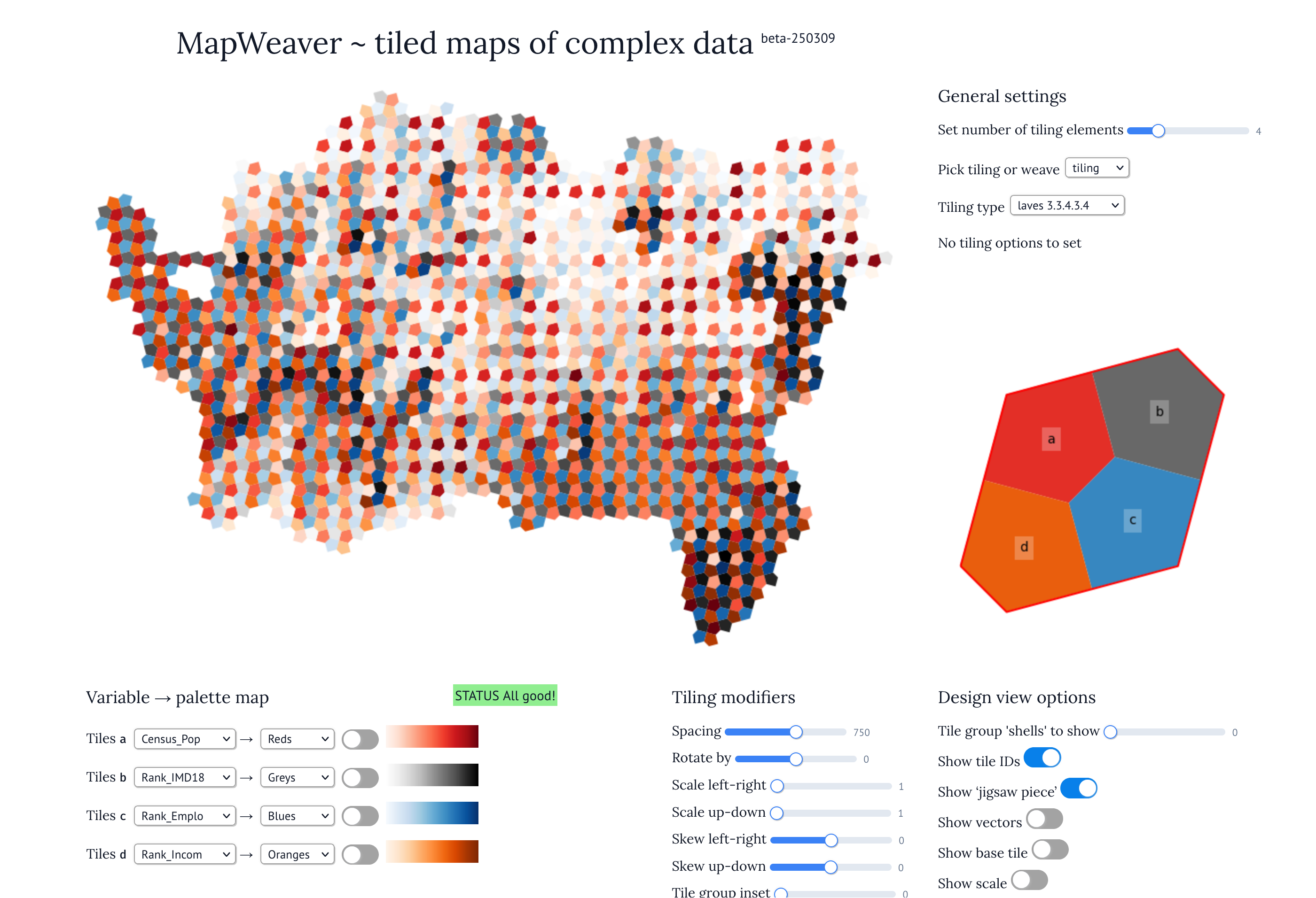 You can choose how many variables you want to include (between 2 and 10), and what kind of tiling or weave pattern you want to use. You can also choose colour ramps to associated with each of the chosen variables. So with a few clicks, you can make this map