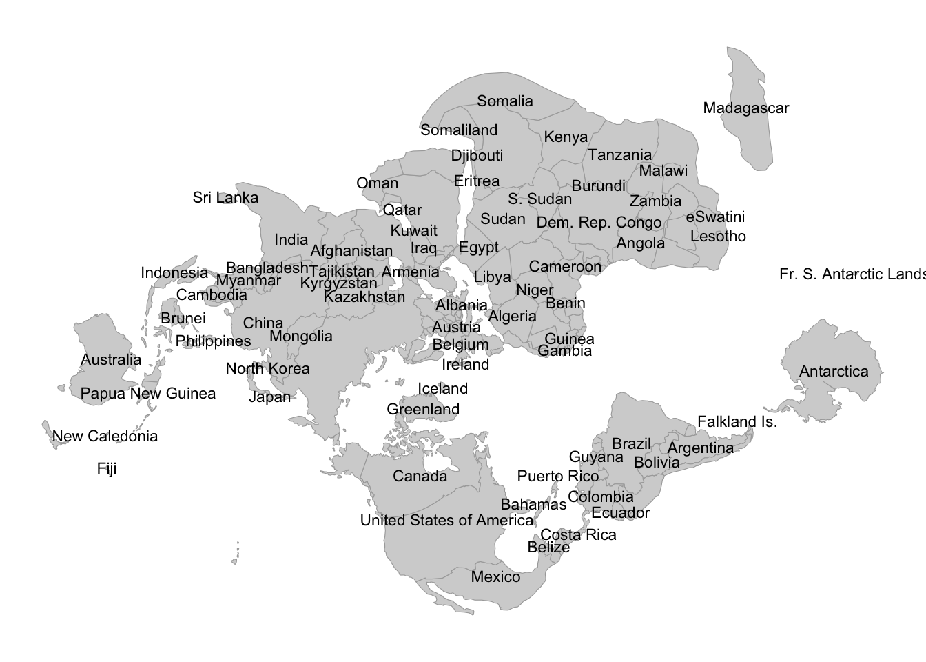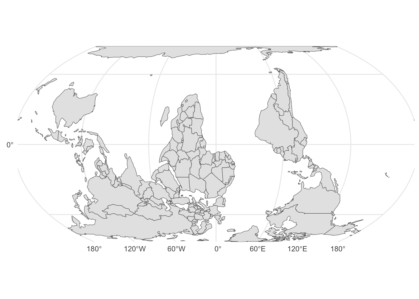 The whole Greenland thing in map projections is a bit played out. I realise it continues to blow minds how exaggerated its size is in the Mercator projection.7 Anyway, it’s not too hard to remake XKCD 2489 using R, provided you aren’t too respectful of, you know, actual projections. Apparently Mercator Greenland is too big even for this comedy projection, as I had to downscale it to 85% of its ‘raw’ Mercator size to get a good match to the published map.