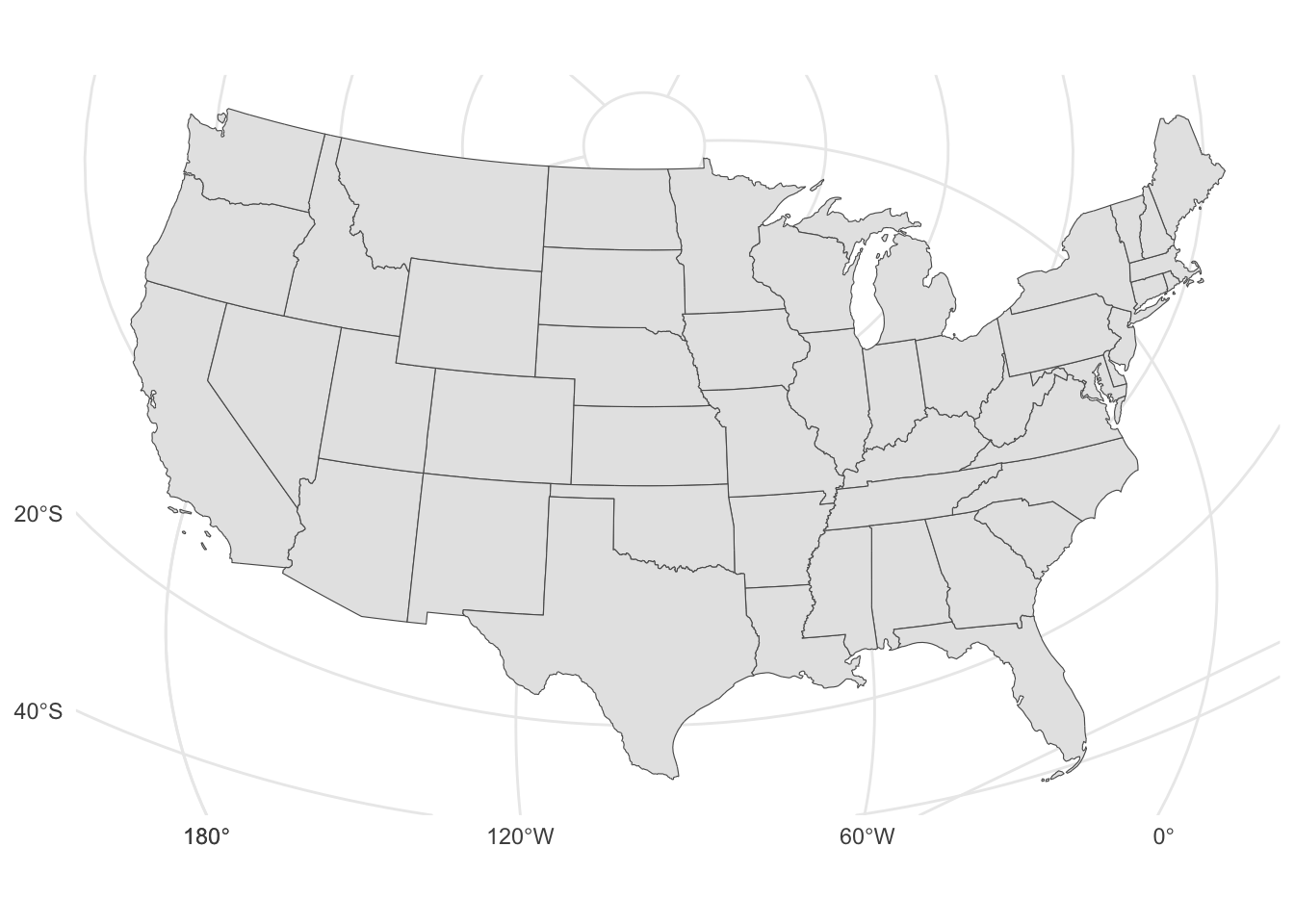 I figured out a way to approximate this projection. First, we project the contiguous 48 states centred on the geographic center and enlarge them so they ostensibly cover a greater part of Earth’s surface. Any projection should work here; I’ve used an azimuthal equidistant one.