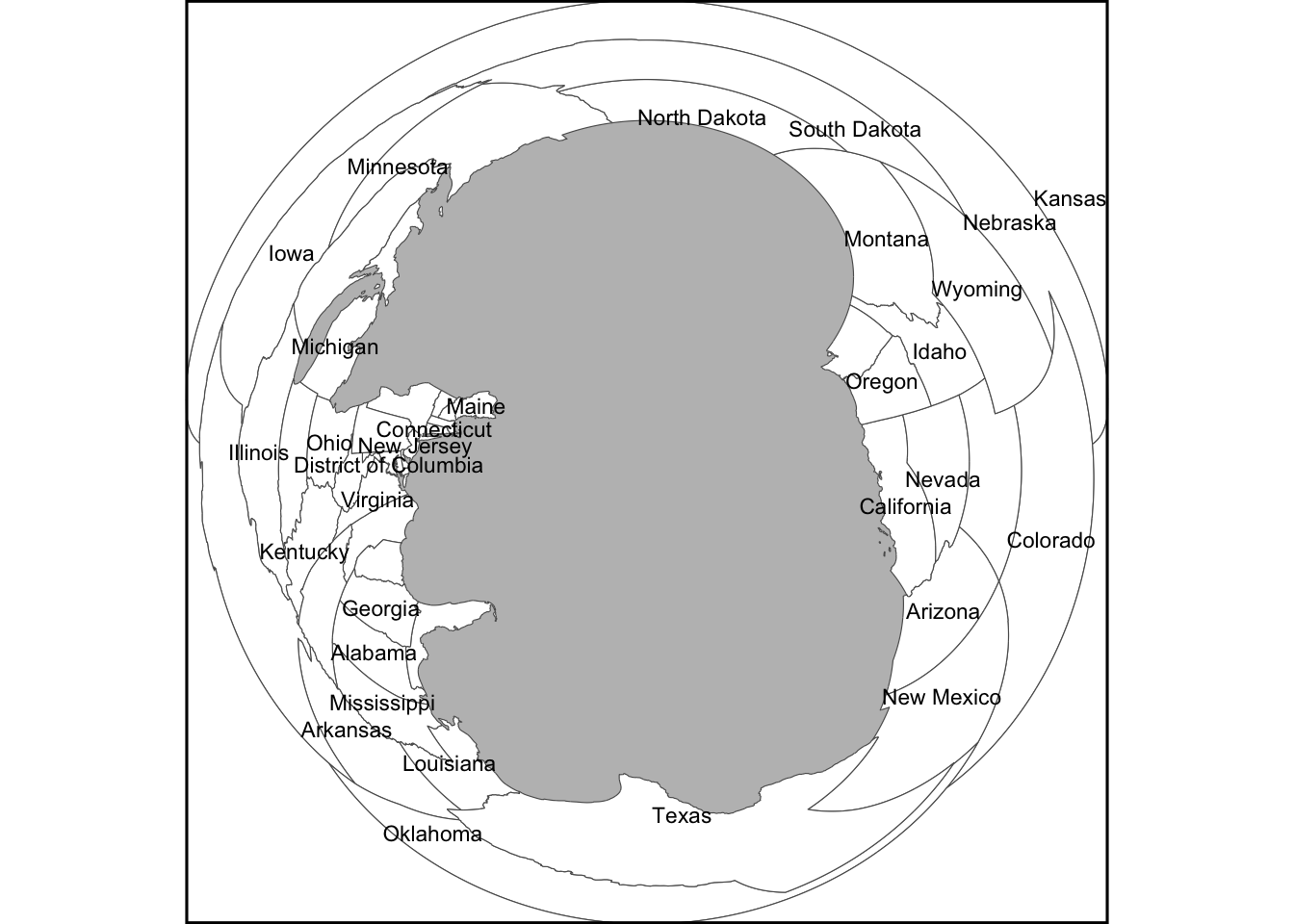 Next we apply an azimuthal equidistant projection centred on the antipode of the geographical centre. At this point we have to ‘turn Kansas inside out’, then remove and add it back into the inverted states.