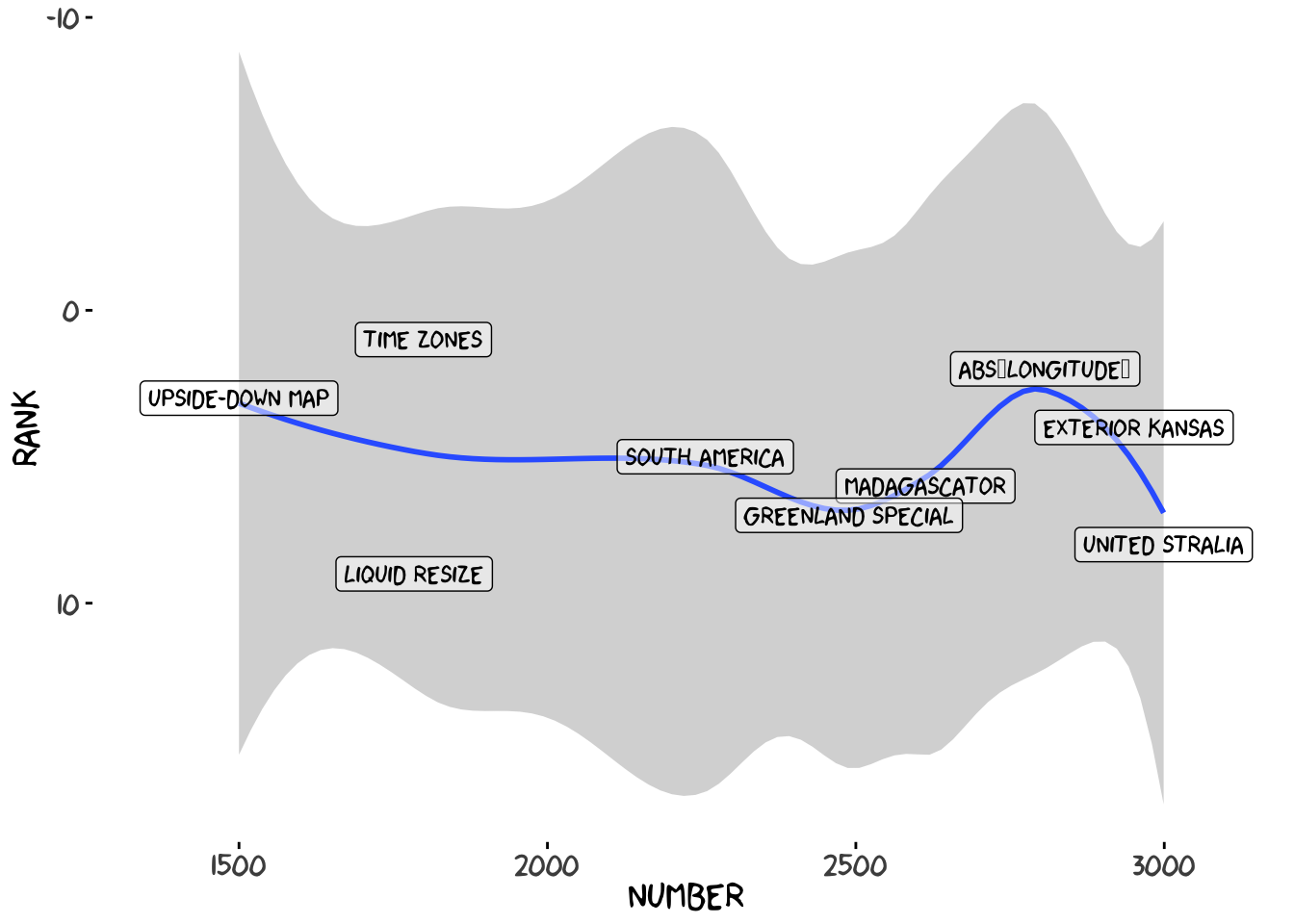 Also, his interest in map projections only seems to have kicked in about halfway through the XKCD time series. Possibly this is related to an ongoing interest in GPS, which will likely be a topic for a future post. #977 Map projections posted in late 2011, is the first sign of an enduring interest in projections, but things don’t really take off until #1500 almost 4 years later, which is the first of several ‘bad map projections’, although not actually called out as such in its title.