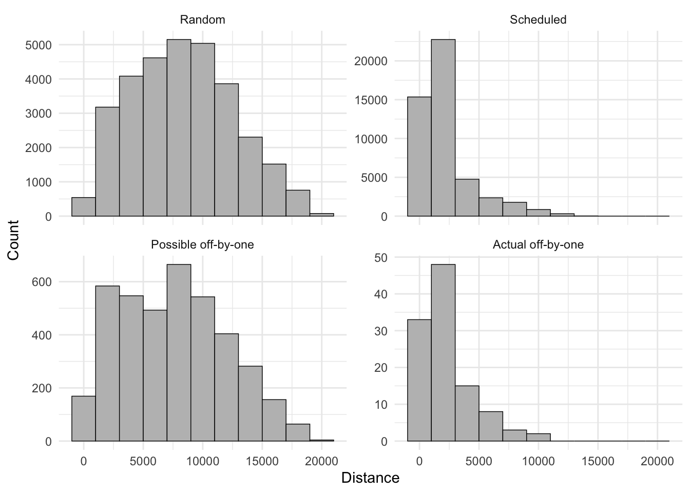 It’s not easy to know exactly how to approach this question. But we might expect, due to geographical patterns in naming and language, that there would be some clustering of the actual off-by-one routes. A rough and ready approach to testing this idea is applied in the code cell below, based on the lengths in km of the various subsets of flights. The idea is that shorter length routes might be more common among off-by-one routes than in scheduled flights in general.