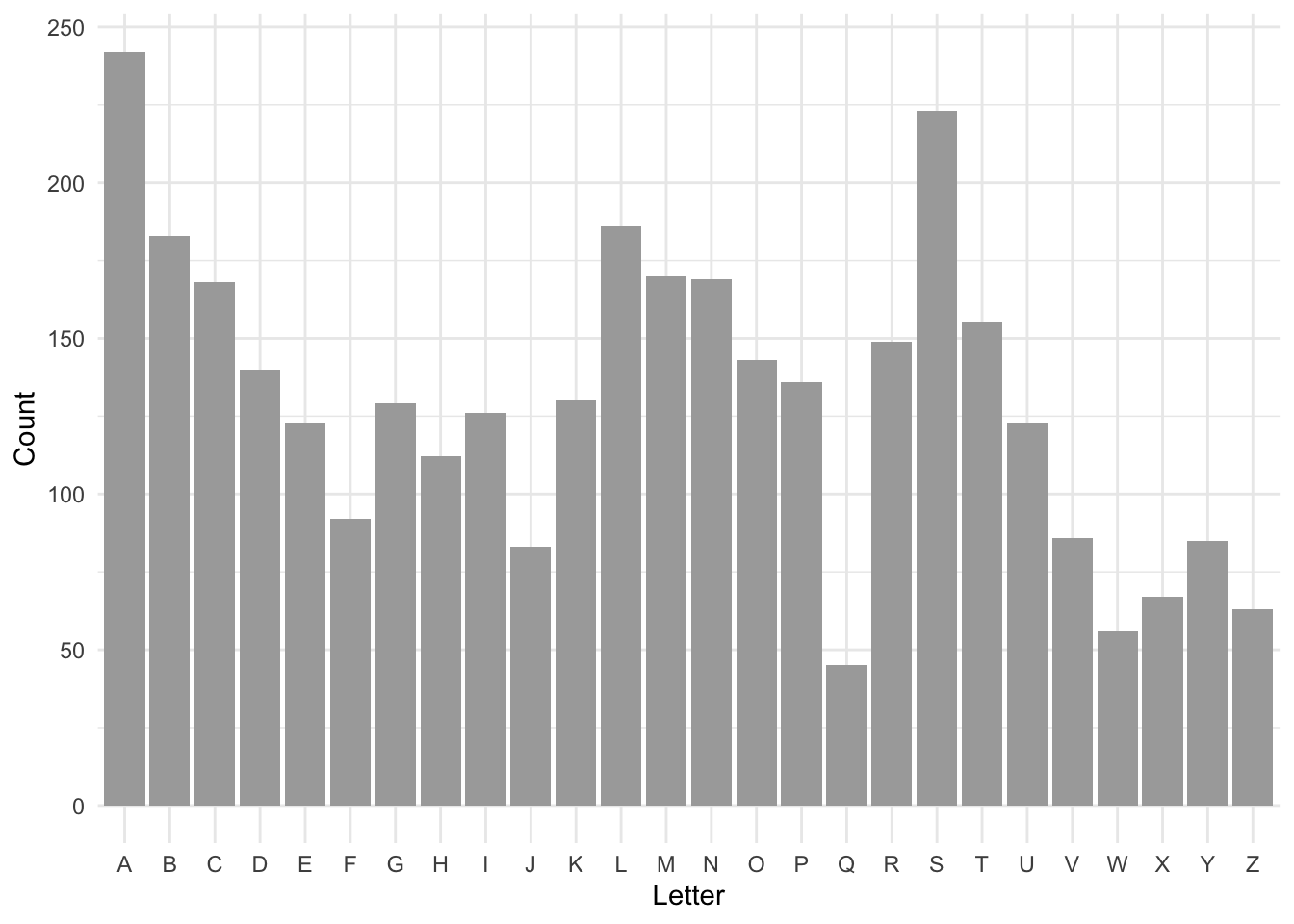 Of course the codes aren’t random, they generally bear some relation to the names of actual places3 and we’d therefore expect the distribution of letters in the codes to be uneven. We can confirm this very easily: