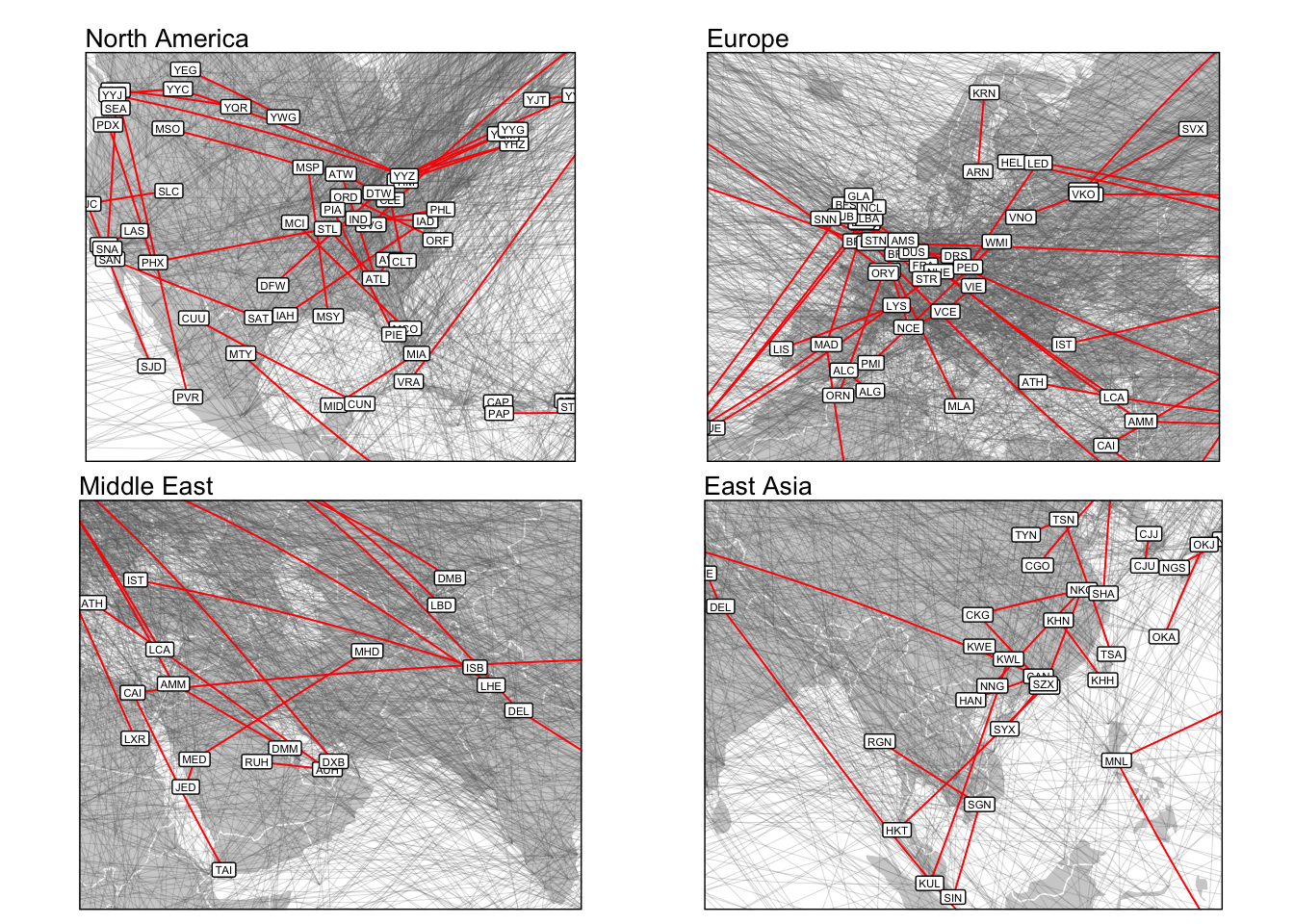 Figure 3: Actually existing routes off-by-one in their IATA codes highlighted in red.