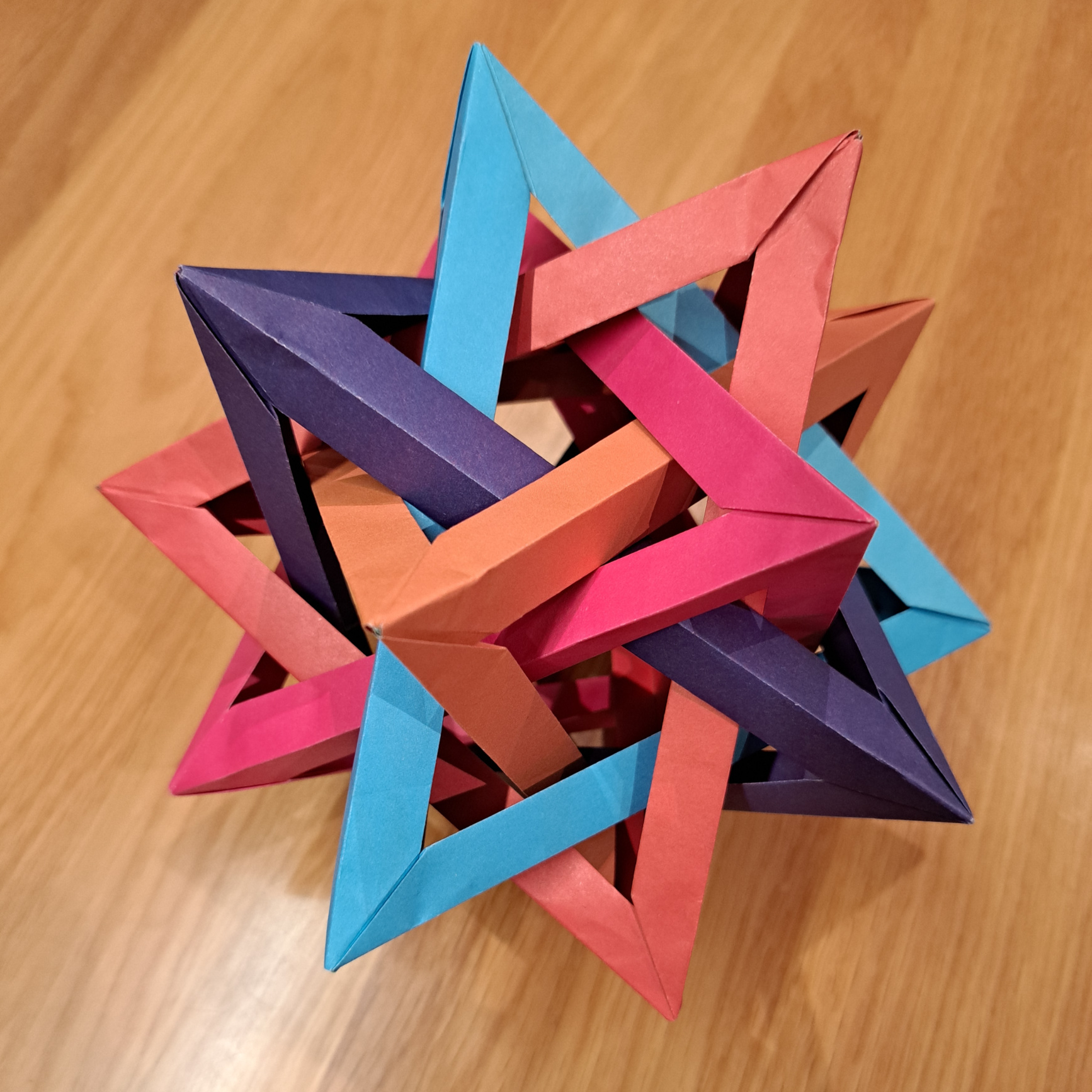 Apropos of nothing in particular, my most recent origami construction is my first proper attempt at Tom Hull’s Five Intersecting Tetrahedra.