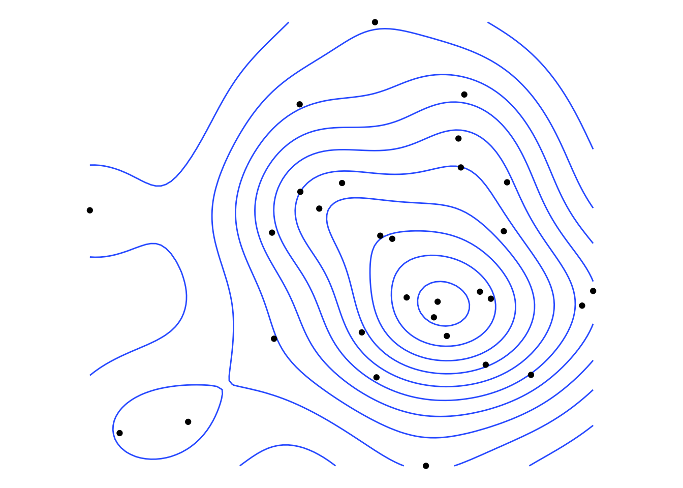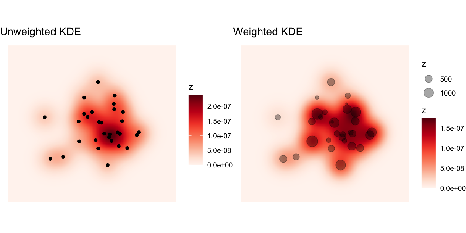 You can also weight the points using the y parameter in the sf.kde function call, but it’s not clear to me that the resulting density estimate respects the total weight associated with the data. If it did, I would expect the value of the weighted surface to be 100 or more times greater than in the unweighted case.