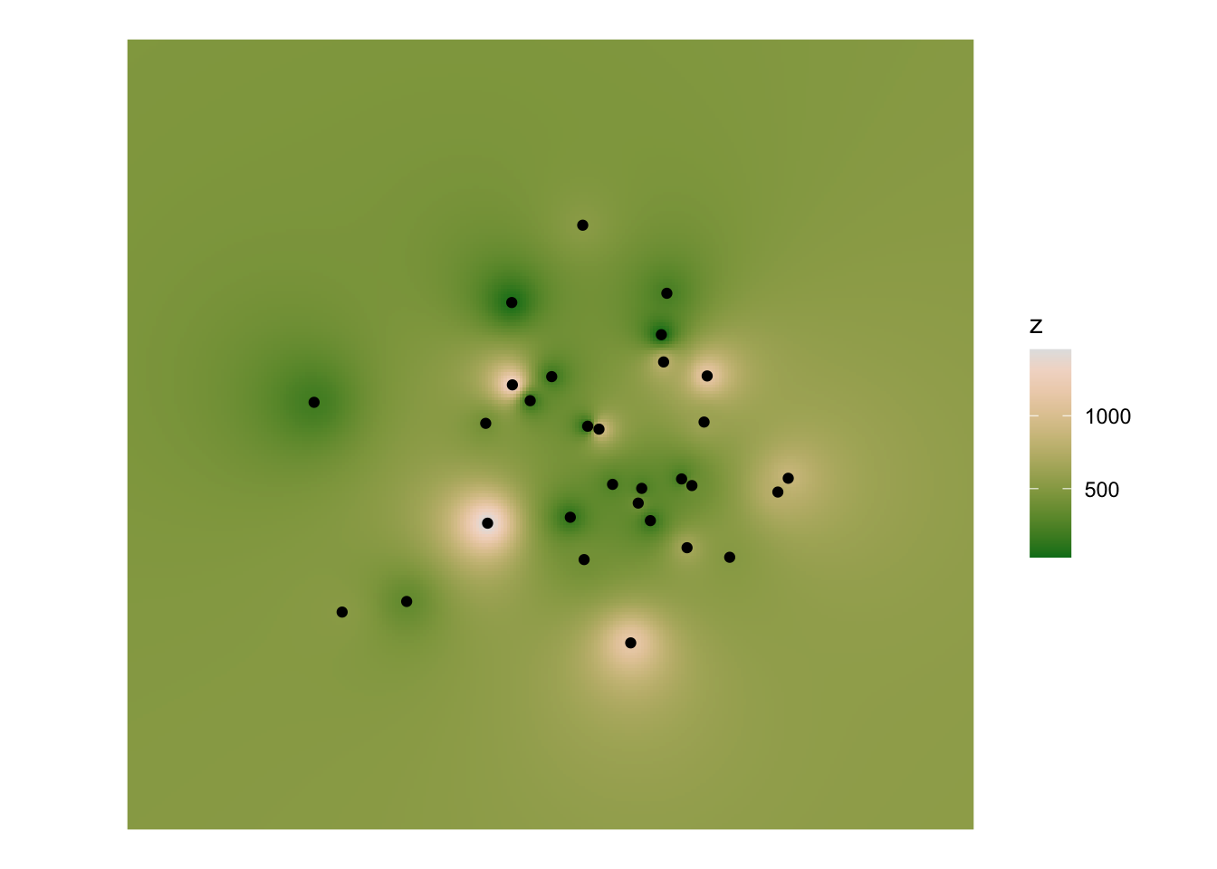 And finally, we can make a map of what we got. This is all a bit circular, because I am using geom_raster for plotting, which requires that I reconvert the raster back to xyz data, but the essential point is that we’ve completed the transformation from point data to an interpolated raster surface!