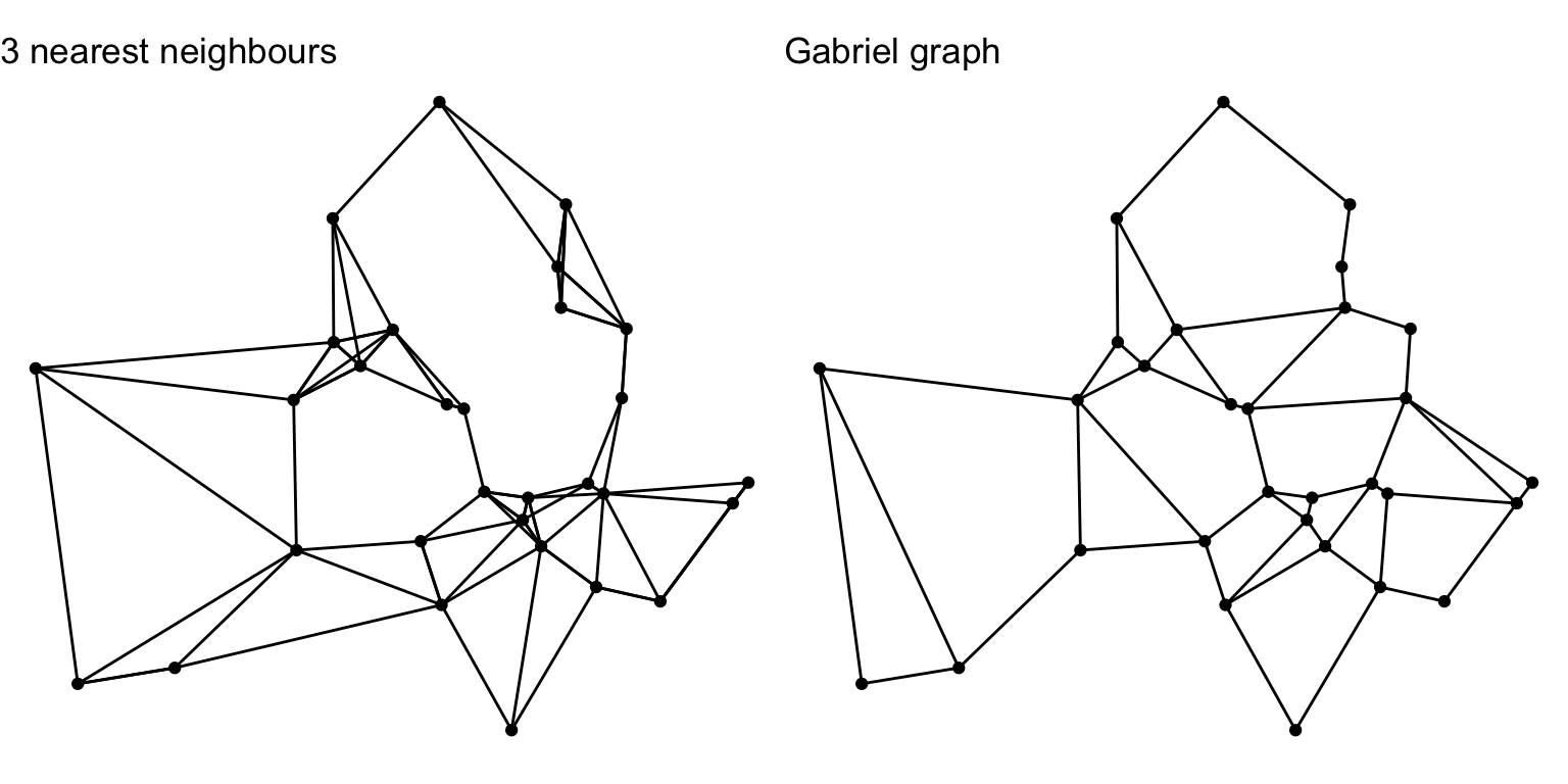 Using the now fairly mature sfdep package along with sfnetworks many options are available, so here are just two, the 3-nearest neighbours and Gabriel graph of our set of points. Once made, the networks contain both edge and vertex data, so to get strictly the lines as a standard sf object we have to ‘activate’ the edges and convert to an sf dataset.