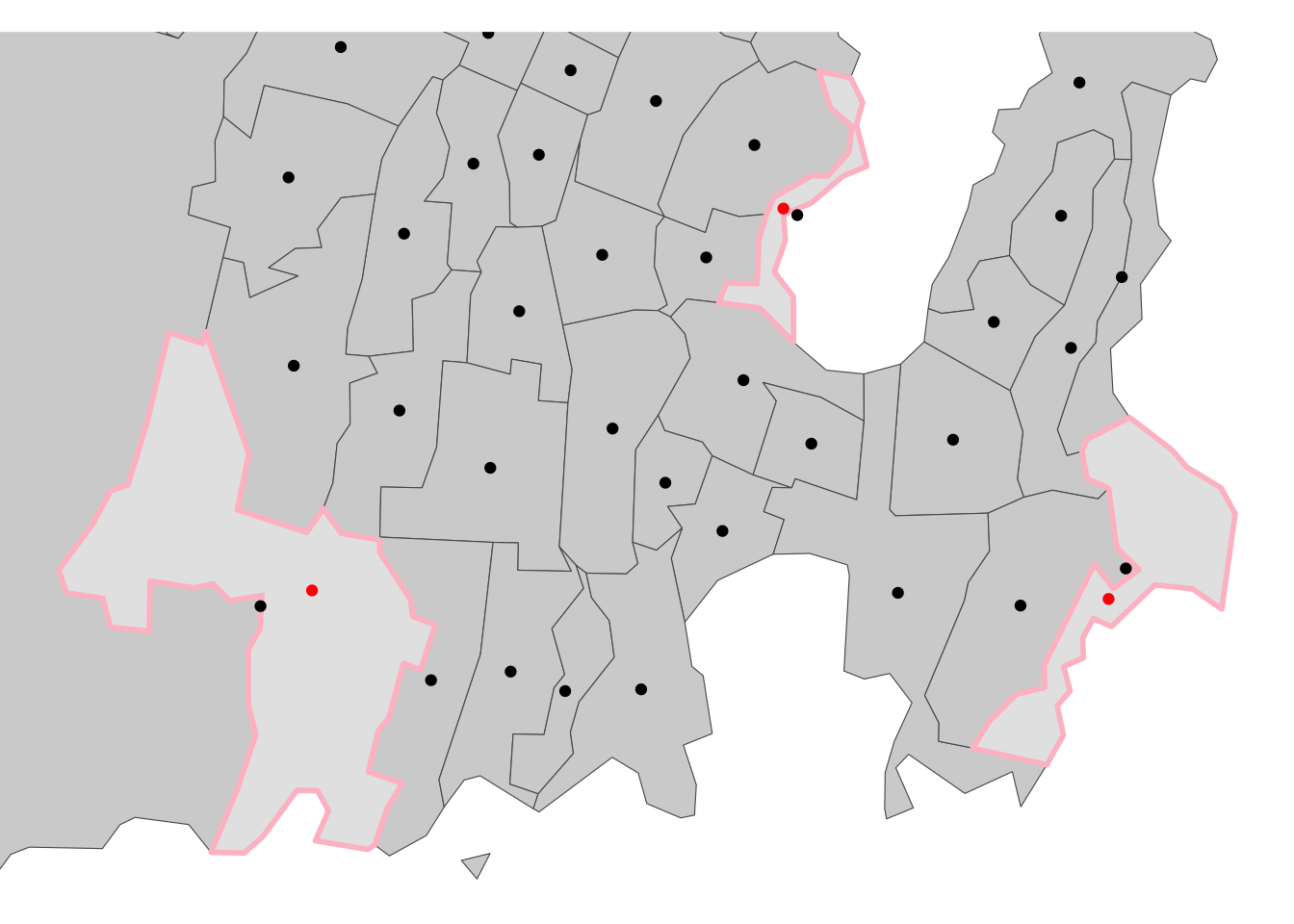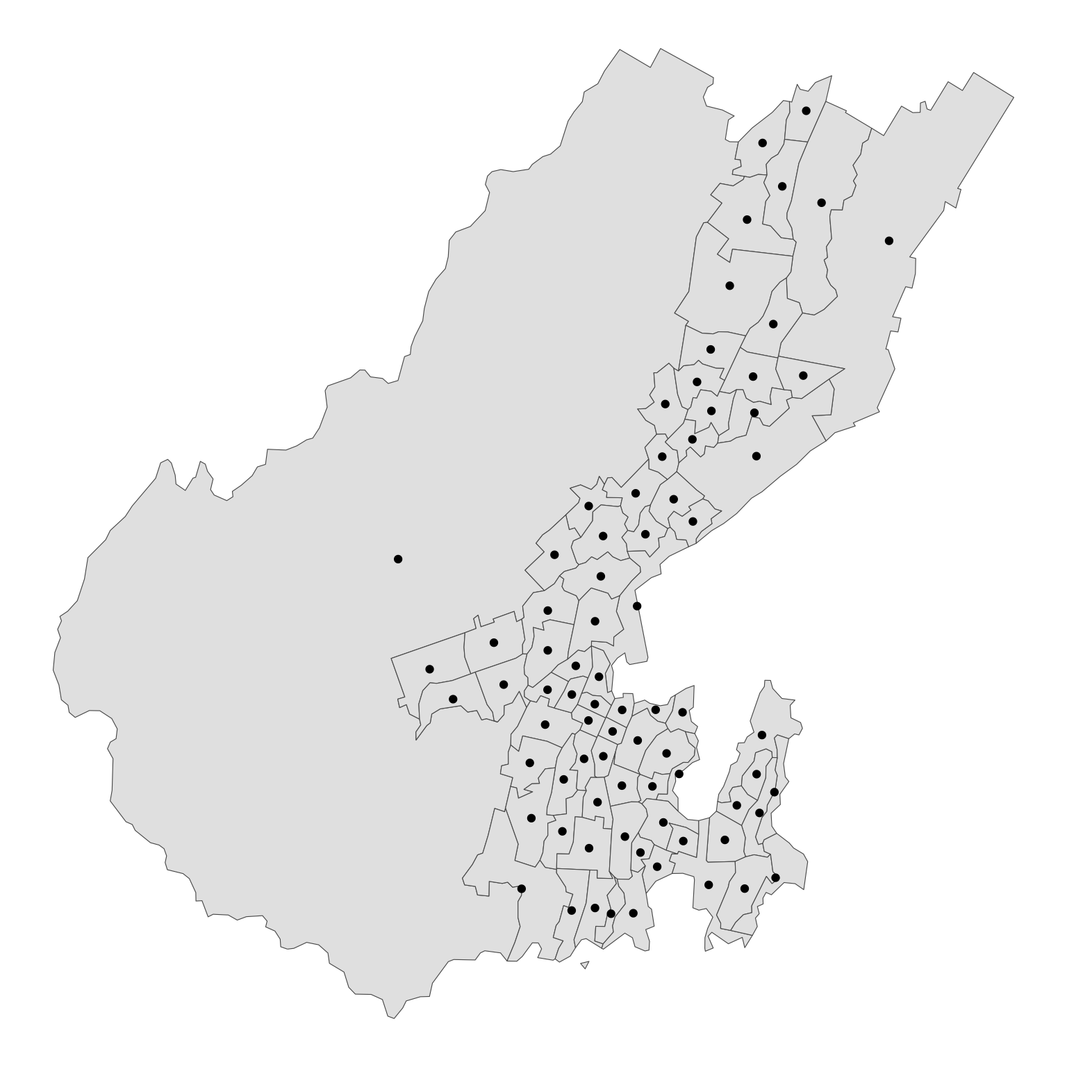 coord_sf(xlim = bb[c(1, 3)], ylim = bb[c(2, 4)])This case is relatively simple, insofar as the polygons that do not contain a centroid have not ‘acquired’ one from a neighbour, so checking for zero centroids correctly identifies ‘problem’ polygons.
