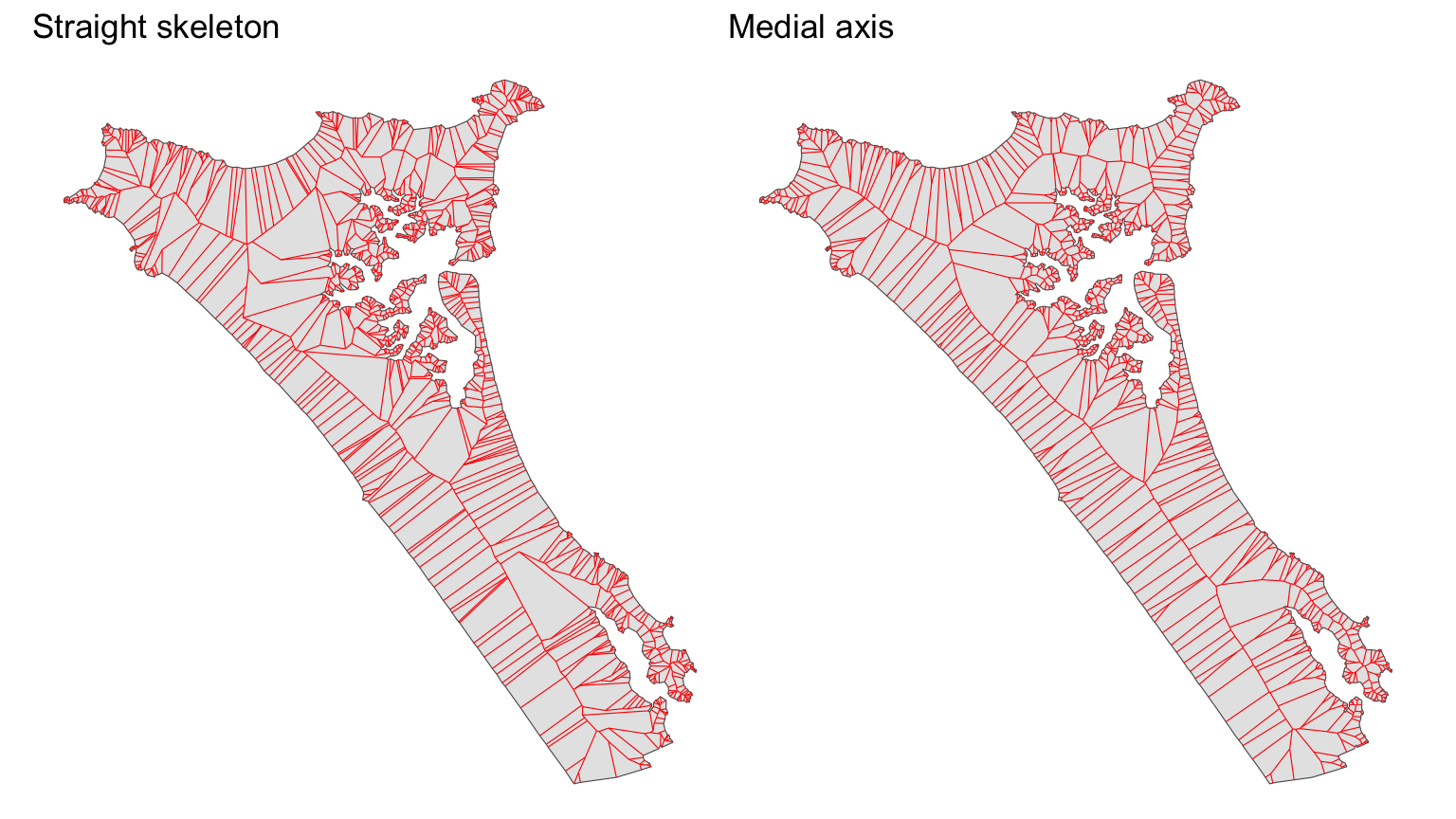 st_set_crs(2193), colour = "red", lwd = 0.2)While I am here, I might as well show the related medial axis, which is the set of points in a polygon that have two or more equidistant closest points on the polygon boundary. Perhaps the most obvious example where this might be of interest is tracing a possible centre-line of a river.