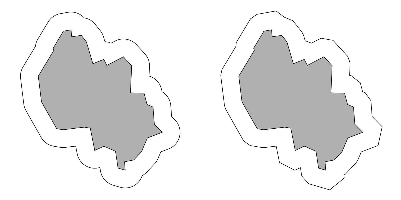 plot(poly_b_400sq, add = TRUE)The first of these with the default settings is what we tend to think of buffering as doing. Why would you want to use the other options?