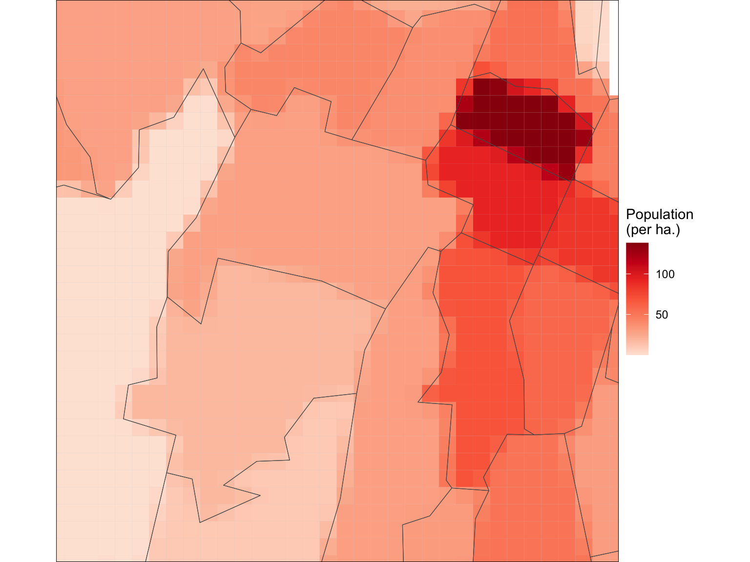 coord_sf(xlim = xr, ylim = yr)What’s (potentially) interesting about this idea, is that at polygon boundaries this process assigns different populations to the ‘raster’ cells. We can see this if we zoom in a bit.