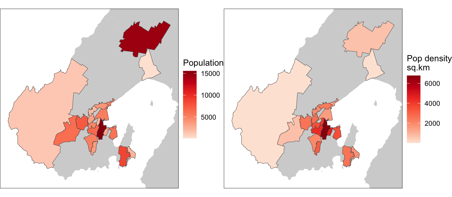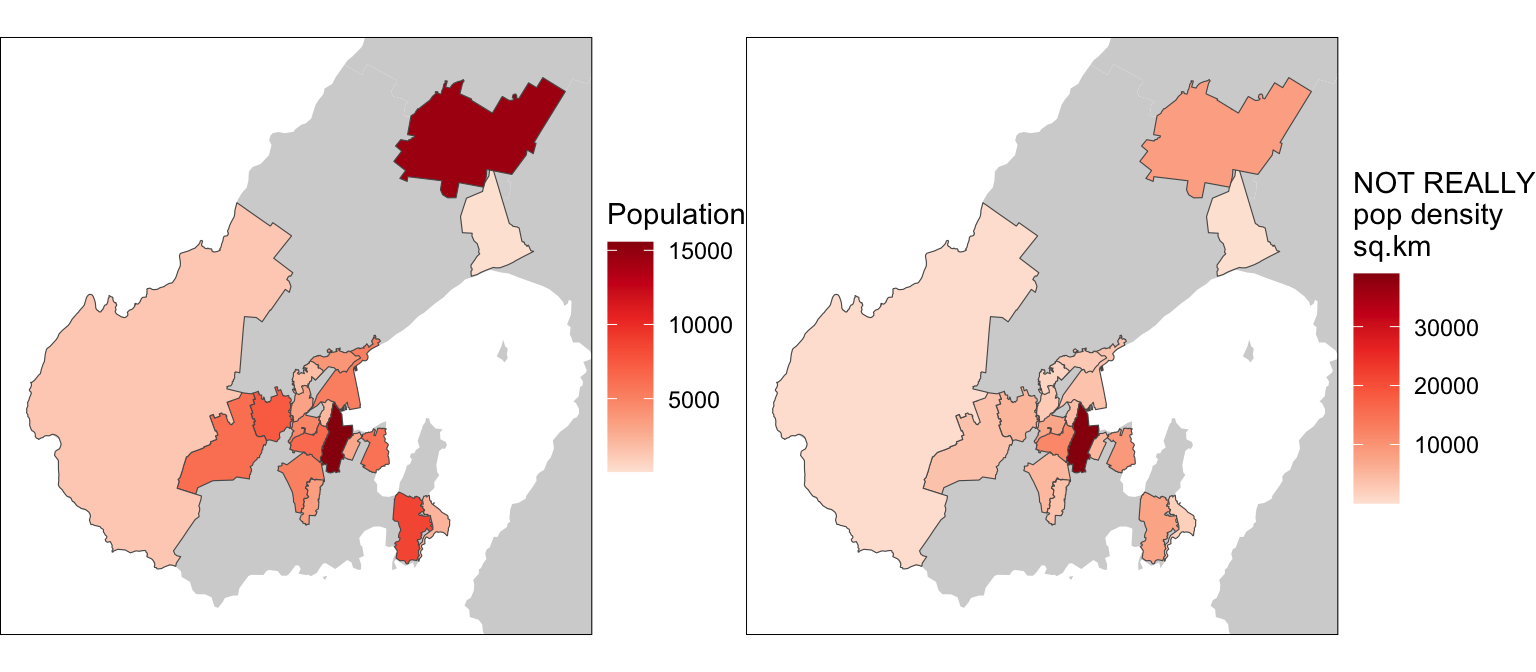 g1 | g2A year or two ago, a nice alternative here would have been to use tmap, which had a convert2density option for choropleth maps, which seamlessly did all the work required to make your map a density map. In version 4, you get a warning that the convert2density option is deprecated, and a recommendation to perform the calculation I performed above anyway. Oh well. Progress, gotta love it!