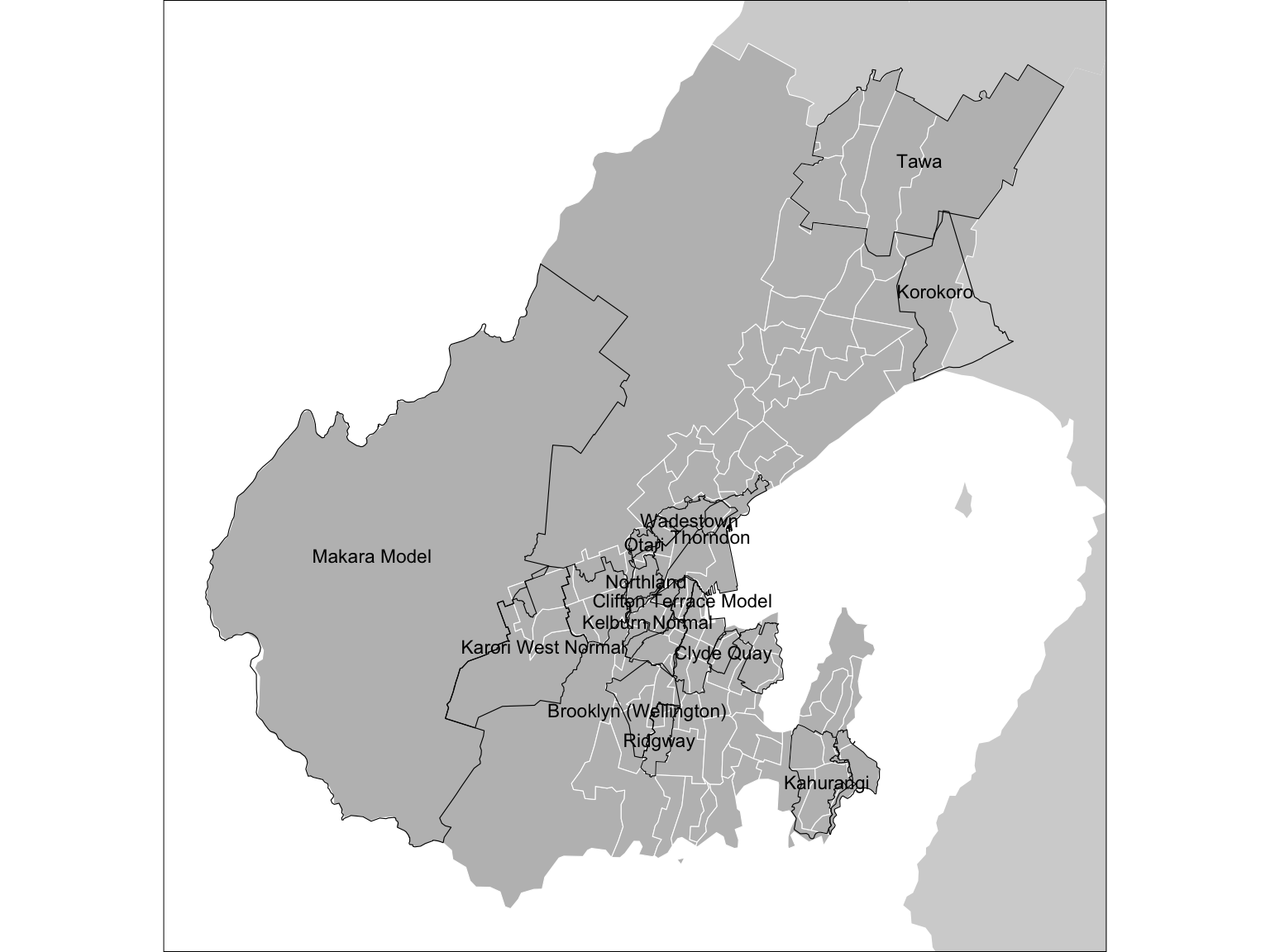 These are primary school zones for the region. Unfortunately, they overlap one another, because school enrolment zones in New Zealand are not centrally administered exclusive areas9—in GIS terms they are not a coverage. That makes mapping them a bit of a pain, but that’s not our central concern for now.