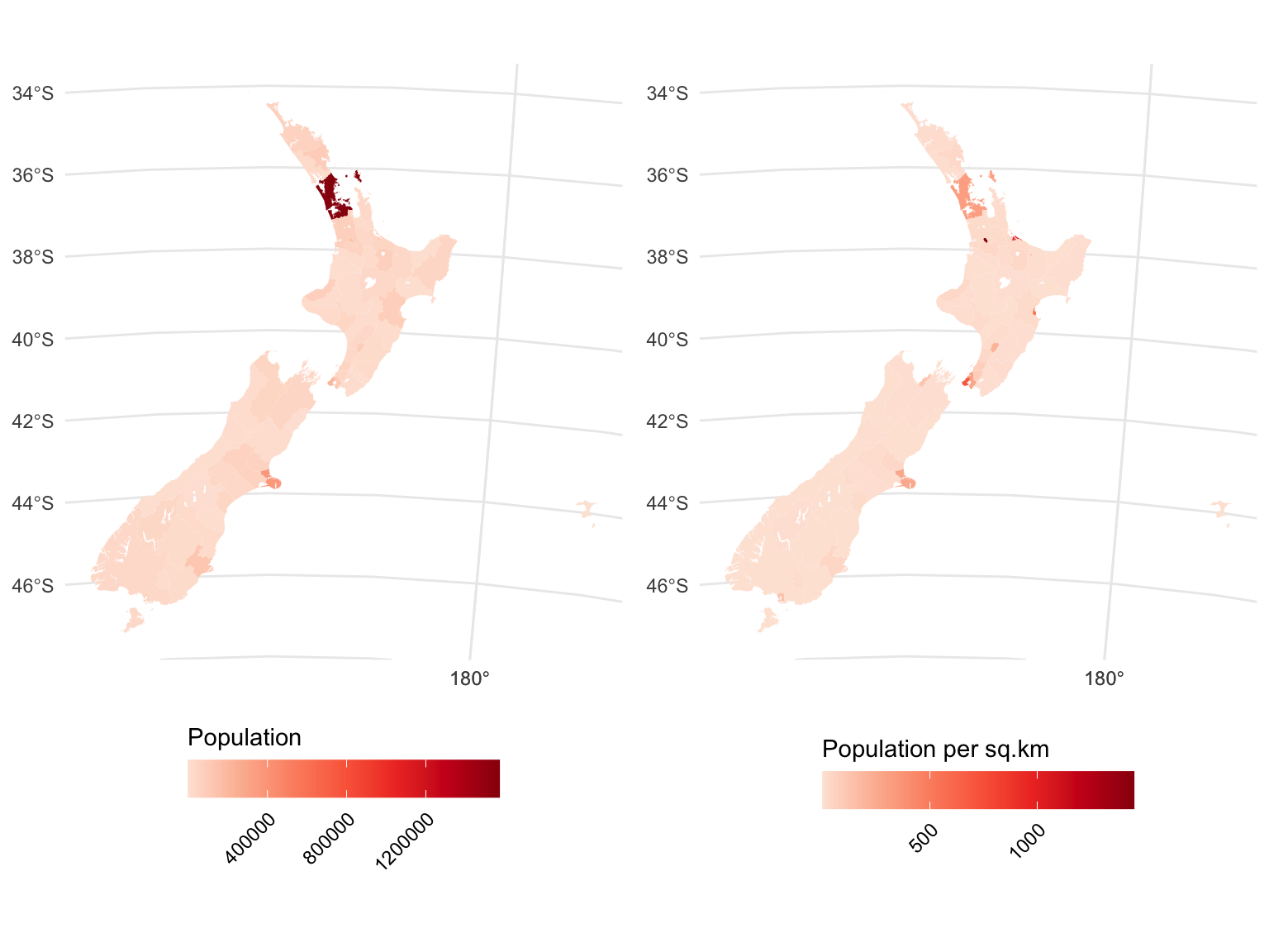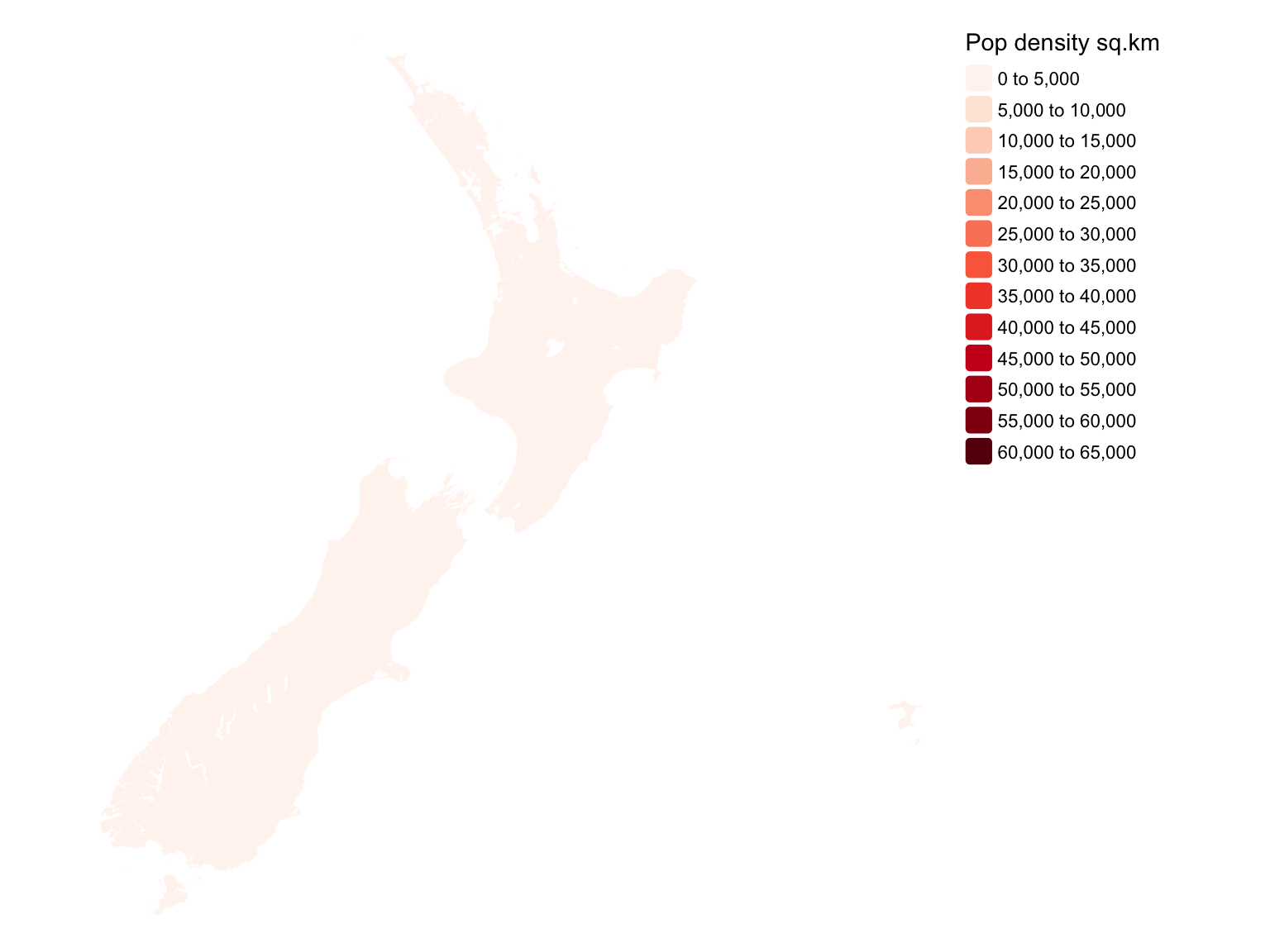 tmap does make it easier to classify the map, which emphasises the essential lack of much in the way of population density in New Zealand. I promise, there are some census areas with those higher population densities, you just can’t see them at this scale.
