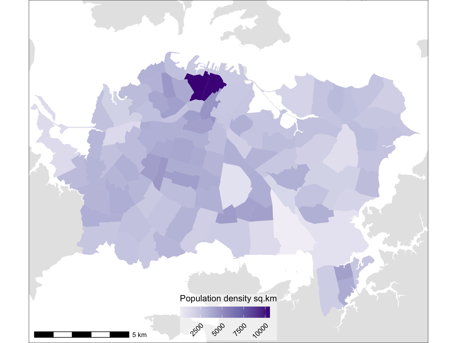 As always, we need some data. It’s surprisingly tricky to find an area of New Zealand where the population density is high(ish) and somewhat variable over an extensive area such that the result of density smoothing are likely to be interesting. Best I can do is some old census data by 100 or so Census Area Units for central Auckland back in 2006.