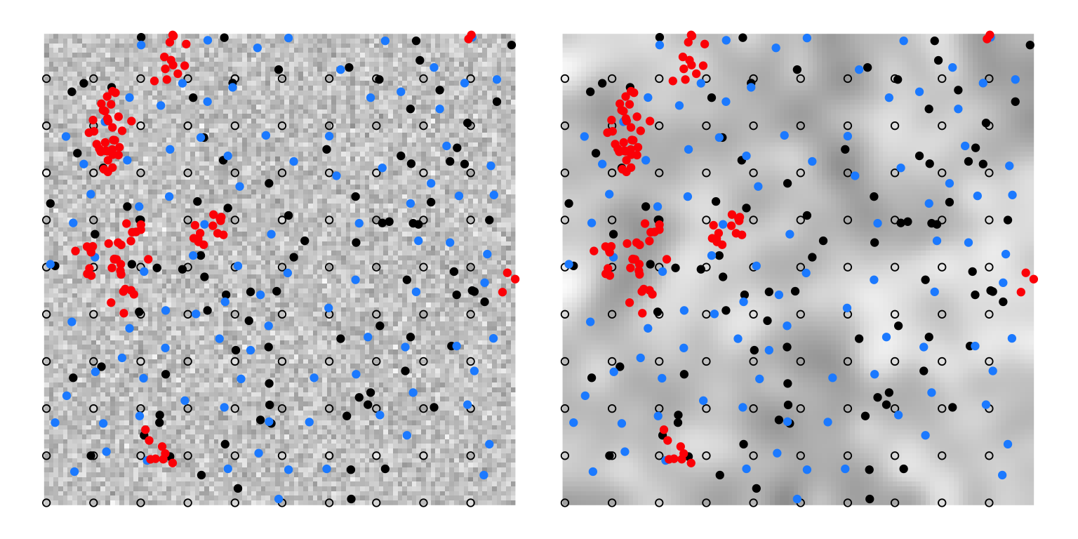 grid_pps <- mapply(get_grid_pp, rep(0:9, 10), rep(0:9, each = 10), SIMPLIFY = FALSE)And here’s what those look like on top of our random and smoothed rasters.
