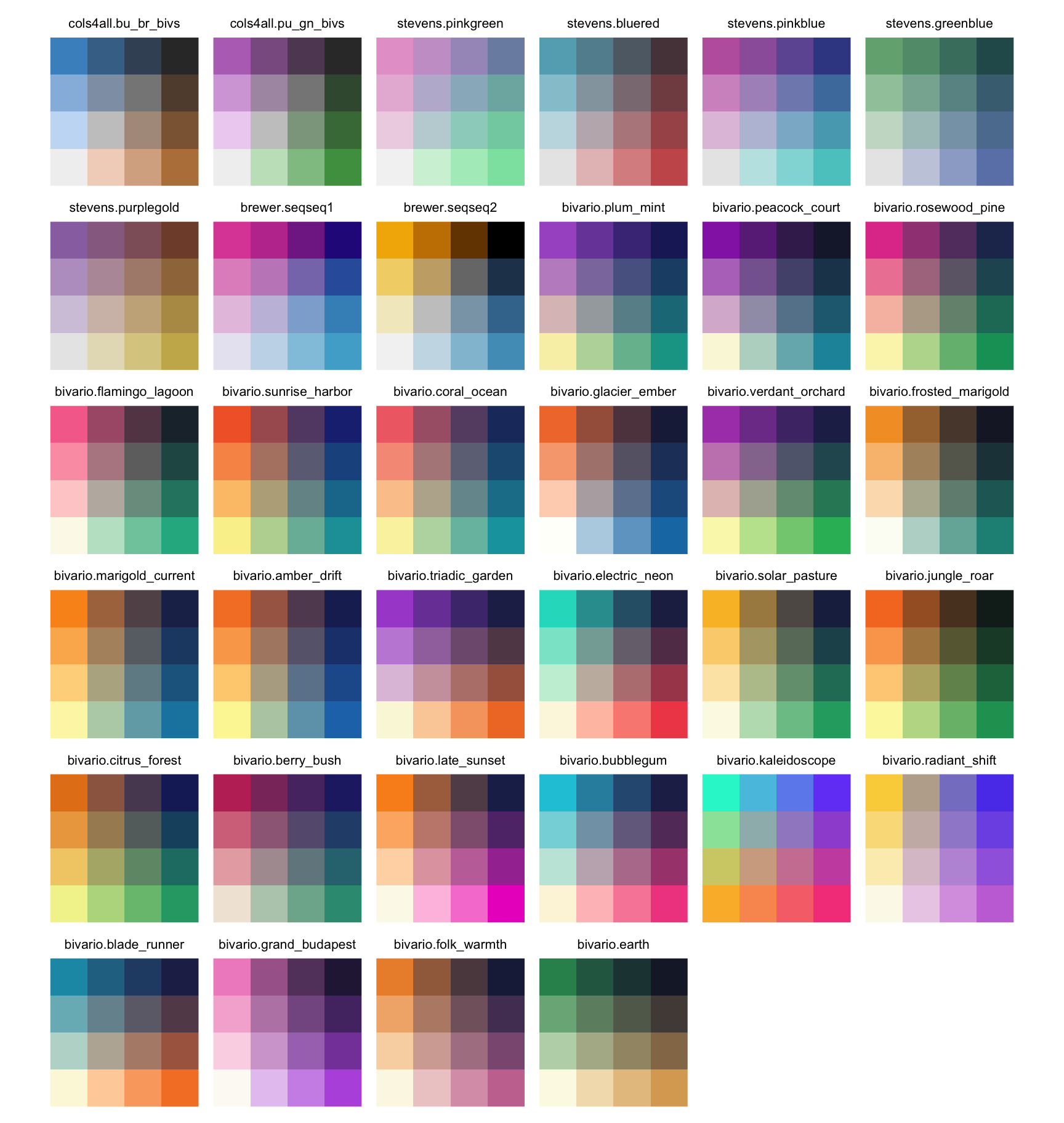 c4a_palettes(type ="bivs") |>lapply(get_palette_grid, n =4, textsize =8) |>wrap_plots()