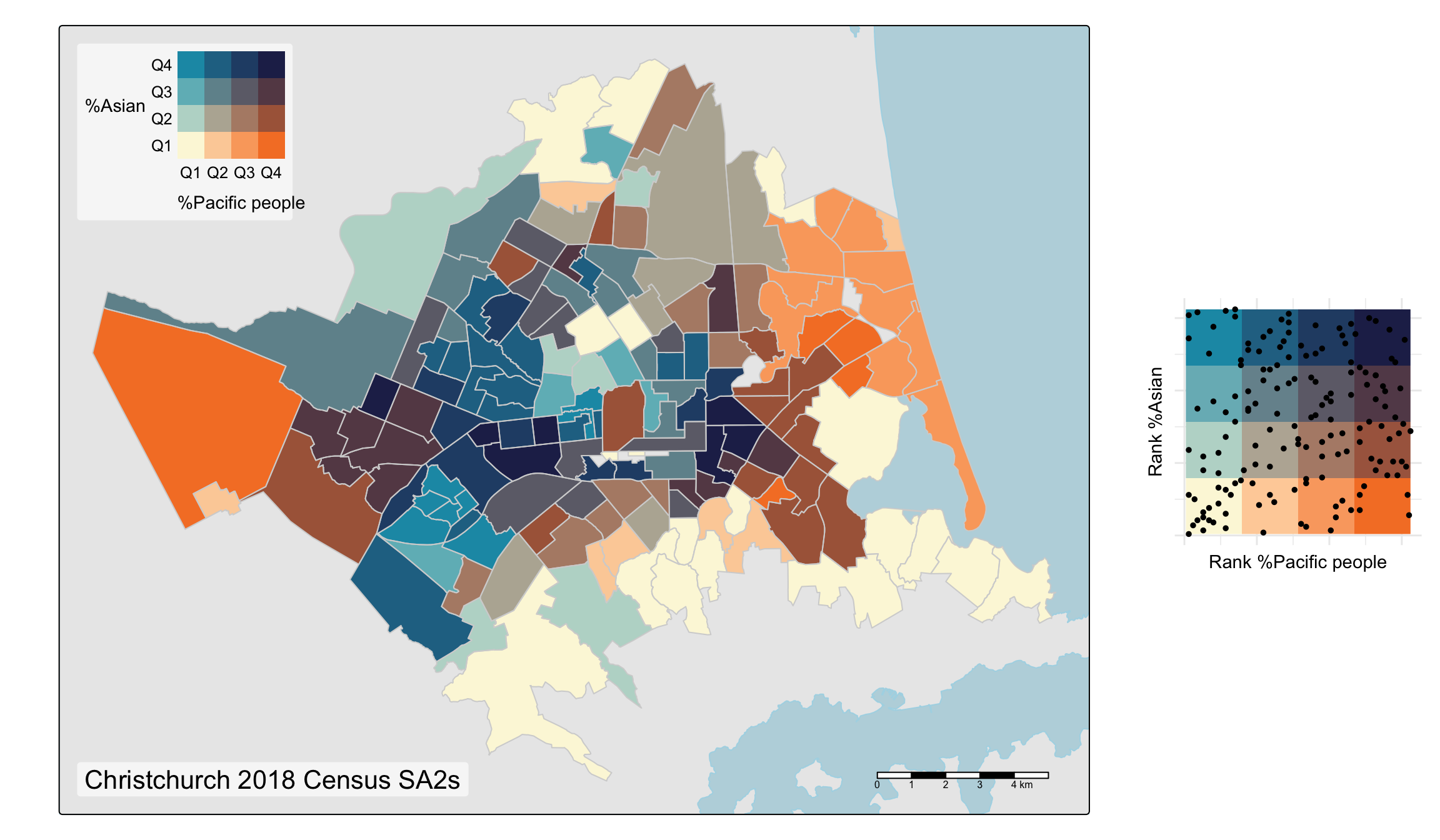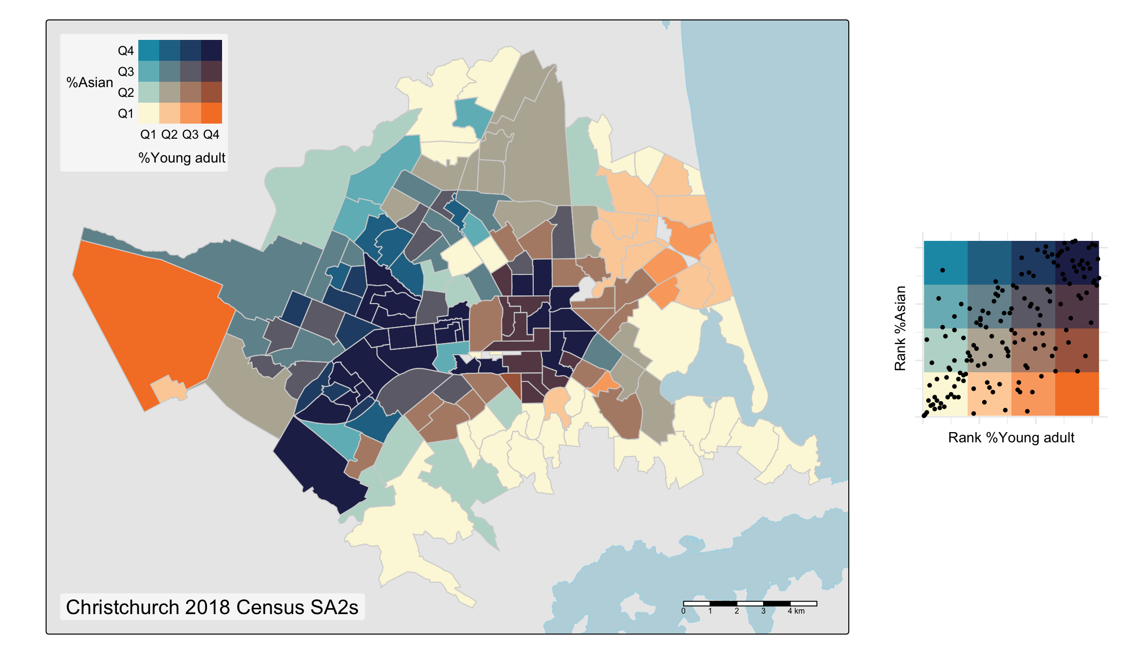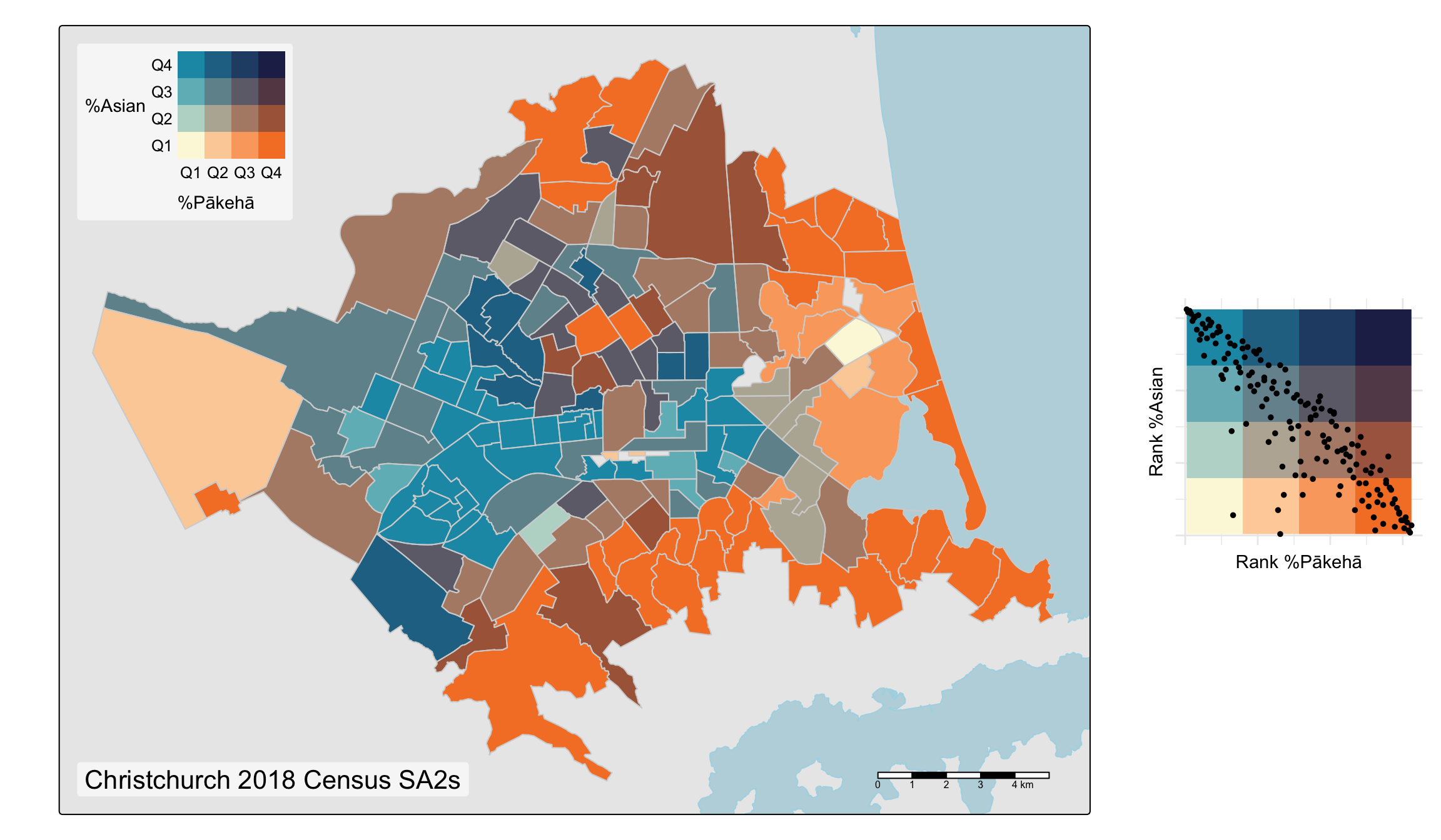 What I hope these plots show is how the overall mix of colours present in the bivariate maps can (with practice!) give an immediate clue to the correlation between the mapped variables. Uncorrelated variables pull colours from all over the palette, while positively and negatively correlated variables pull colours from opposing diagonals of the palette. In these examples, this effect is particularly apparent in the last map where colours from the upper left and lower right of the palette predominate. Areas with a relatively large Asian population presence (in the centre city and around the university to the west) have relatively low Pākehā (New Zealand European) population presence and vice-versa.