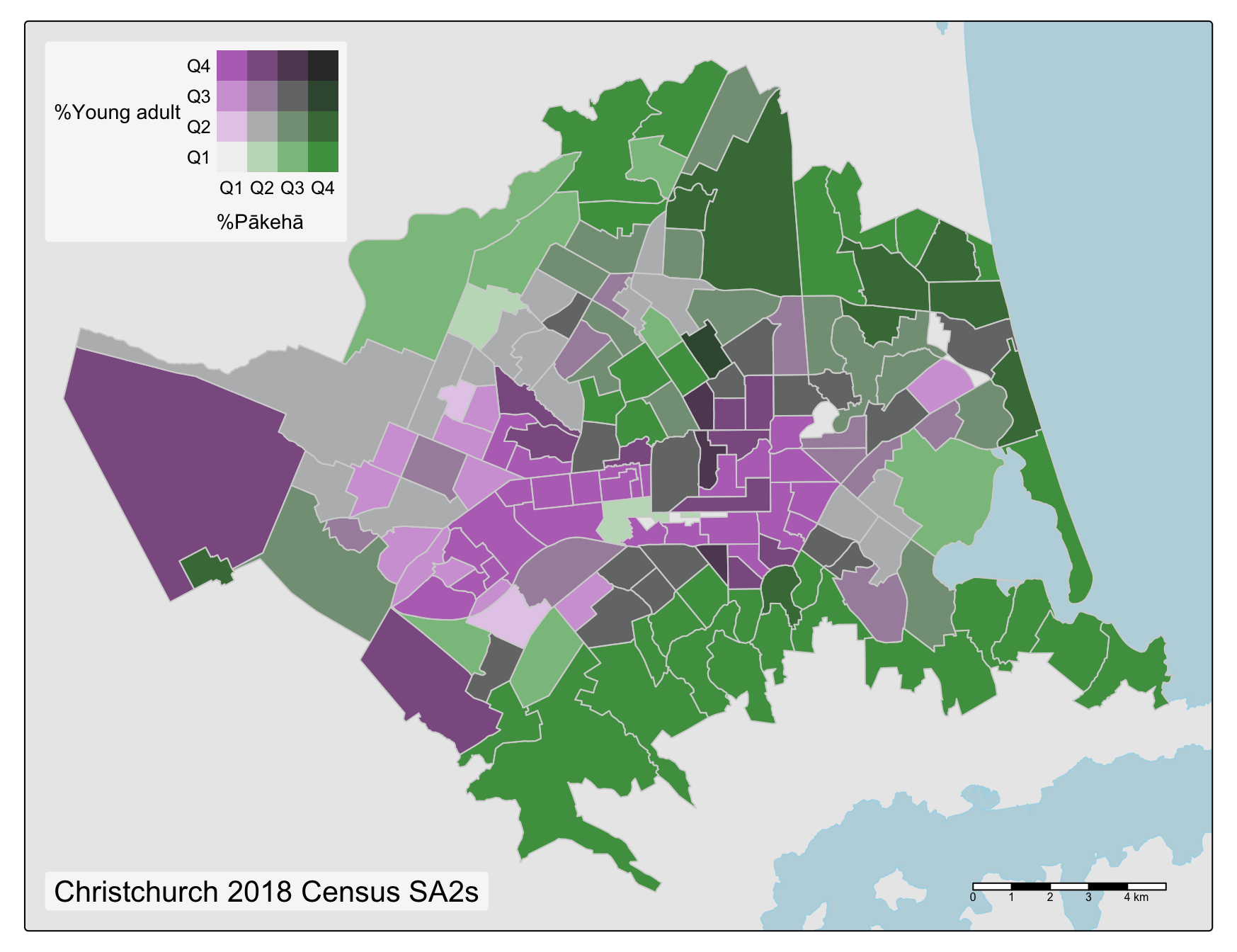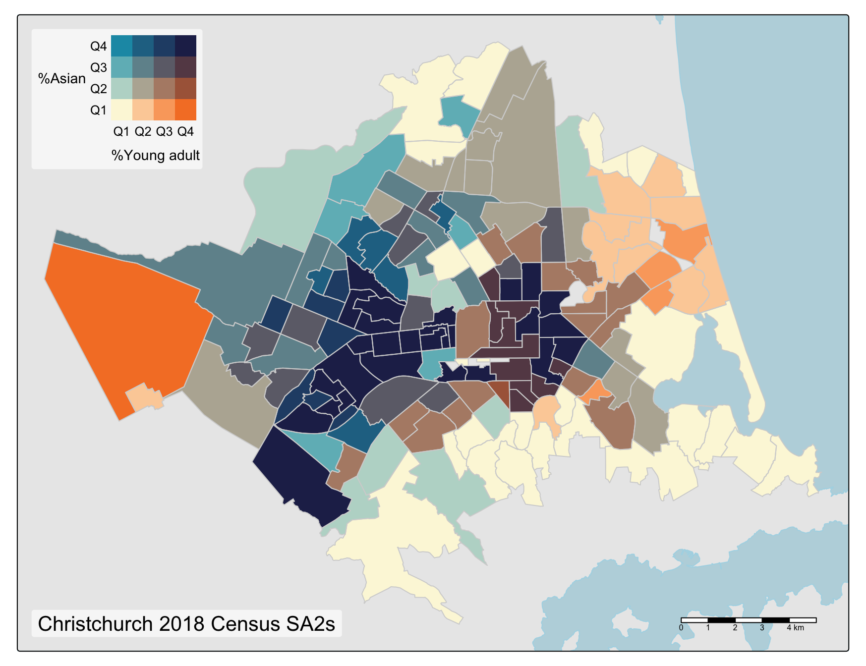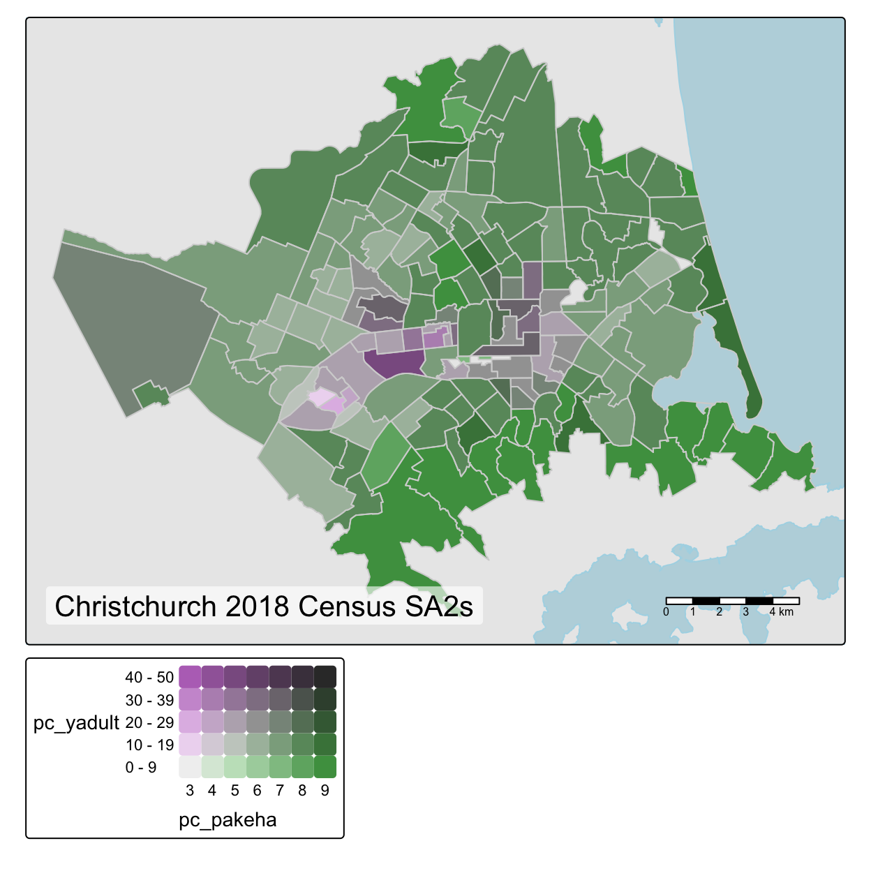What I hope these plots show is how the overall mix of colours present in the bivariate maps can (with practice!) give an immediate clue to the correlation between the mapped variables. Uncorrelated variables pull colours from all over the palette, while positively and negatively correlated variables pull colours from opposing diagonals of the palette. In these examples, this effect is particularly apparent in the last map where colours from the upper left and lower right of the palette predominate. Areas with a relatively large Asian population presence (in the centre city and around the university to the west) have relatively low Pākehā (New Zealand European) population presence and vice-versa.