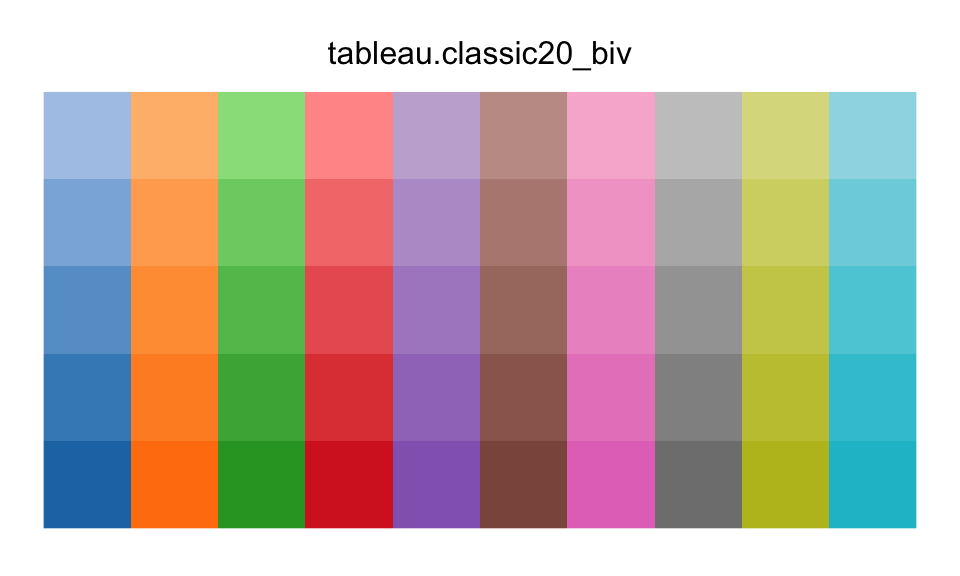 cols4all also offers an array of sequential-diverging, sequential-categorical, and ‘sequential-desaturated’ palettes. I recommend viewing those using the cols4all::c4a_gui() function, which allows you to interactively explore all these palettes and the many, many more conventional palettes cols4all supports. For what it’s worth in most cases these palettes combine a set of categorical colours with a sequence of levels of intensity or saturation. For example, here is tableau.classic20_biv: