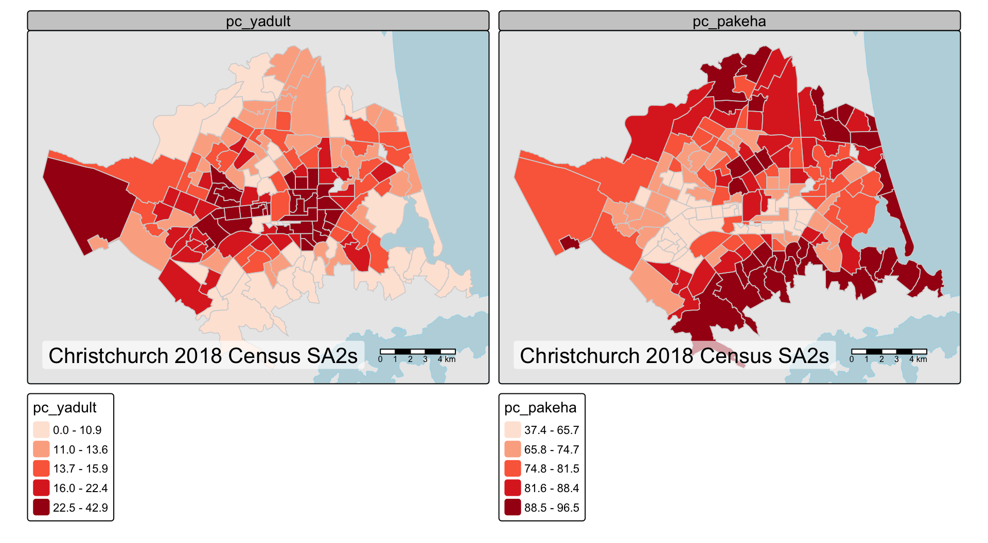 Because we are using a quantile classification to make the maps, the relevant measure of correlation is Spearman’s rank. Inspection of the data shows that the pc_asian (%Asian) variable is suitably related to the pc_pacific (%Pacific people), pc_yadult (%Young adult) and pc_pakeha (%Pākehā) variables, respectively: