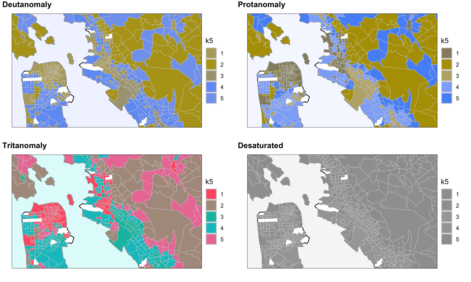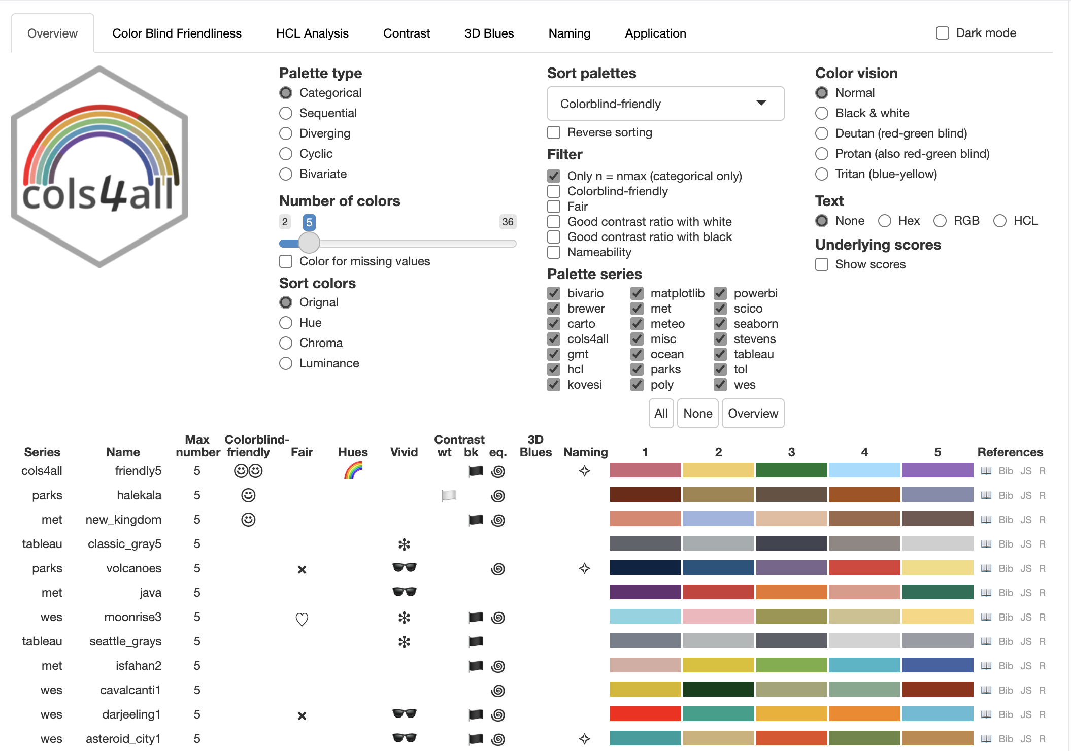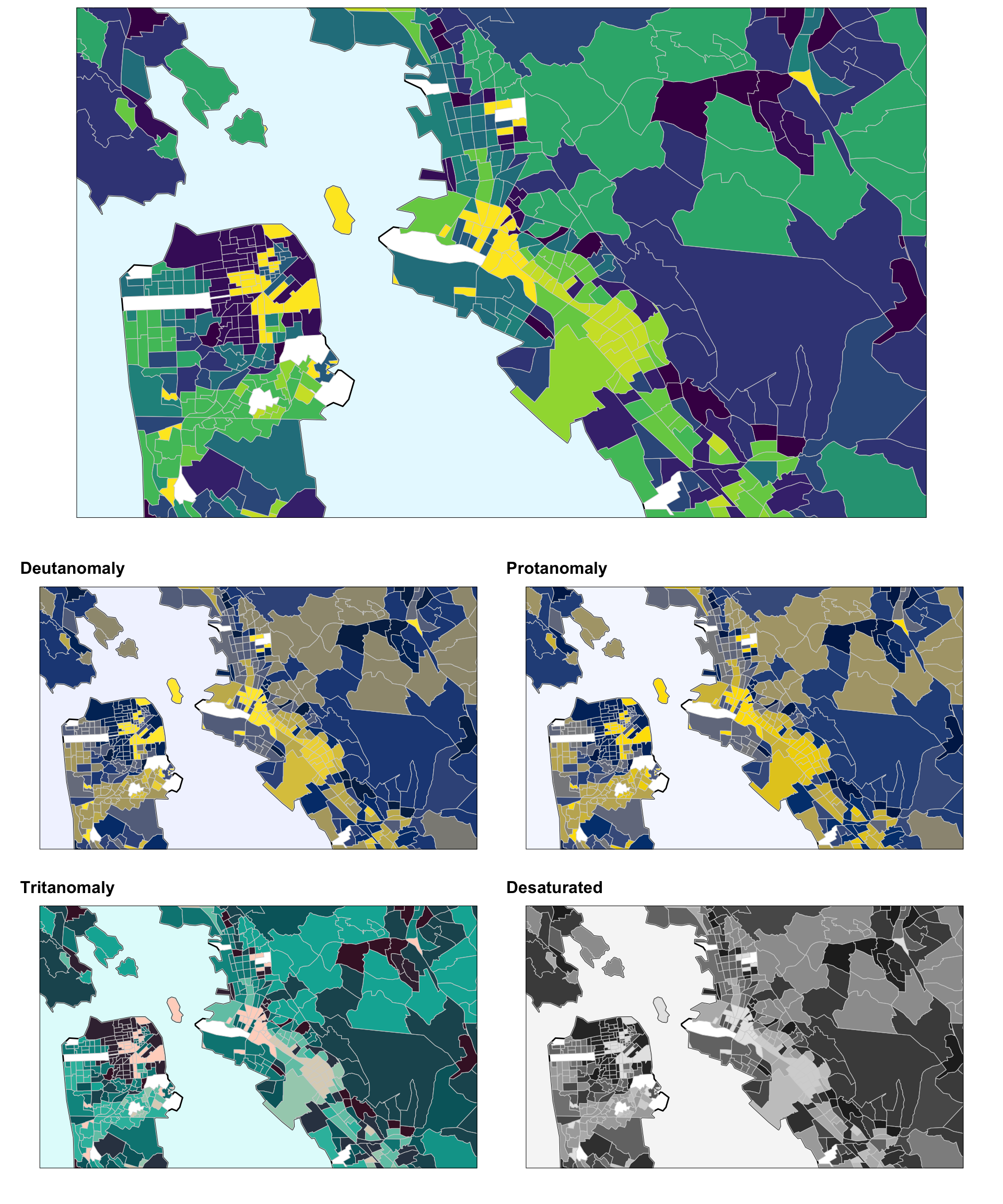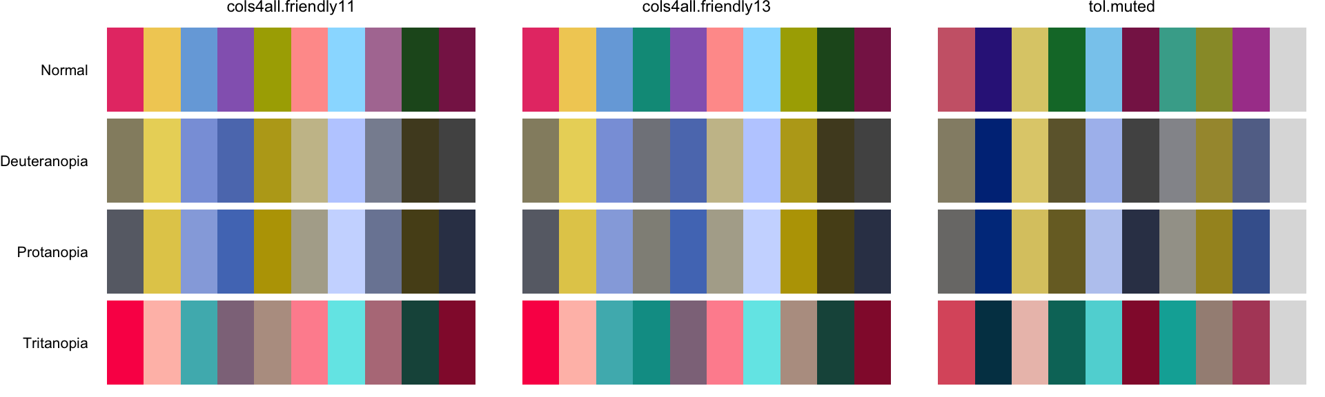 The colorspace package provides the underlying ‘machinery’ to drive all of this, supporting ways to manipulate colours, such as darkening or lightening them, increasing or decreasing saturation, and, particularly relevant here, simulating different CVDs. colorblindr and colorblindcheck wrap the colorspace functionality up in various ways making some low-level operations more convenient. Finally, cols4all collates numerous palettes from many sources, and provides tools you can use to explore their usefulness under difference CVDs.