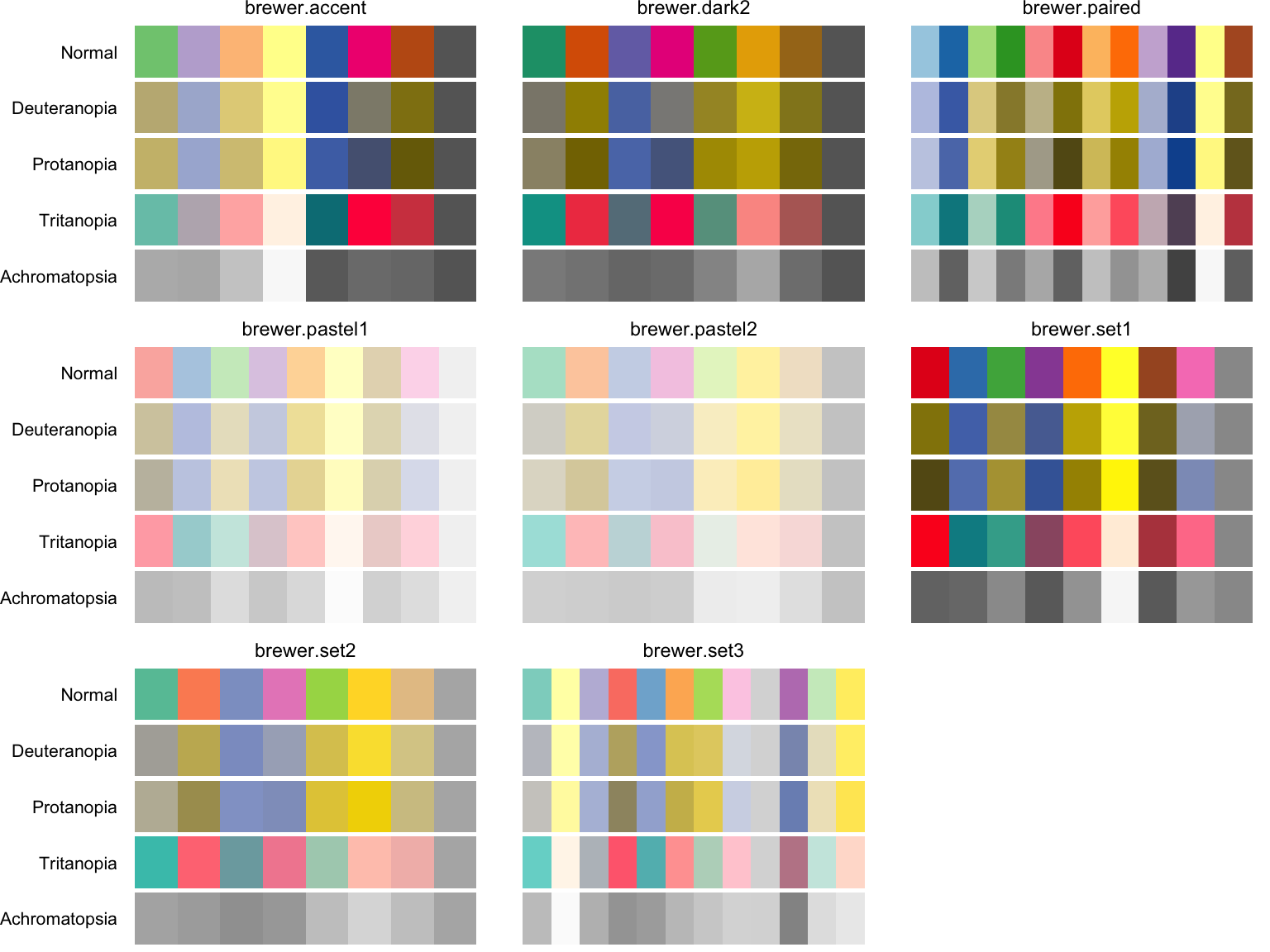 In spite of this good understanding, colour palettes readable by those with CVDs have only come to widespread attention recently. That said, there are now many options in R for exploring the readability of graphics under different CVDs. In the way of R, perhaps a few too many, making it a little difficult to pick a path through things.