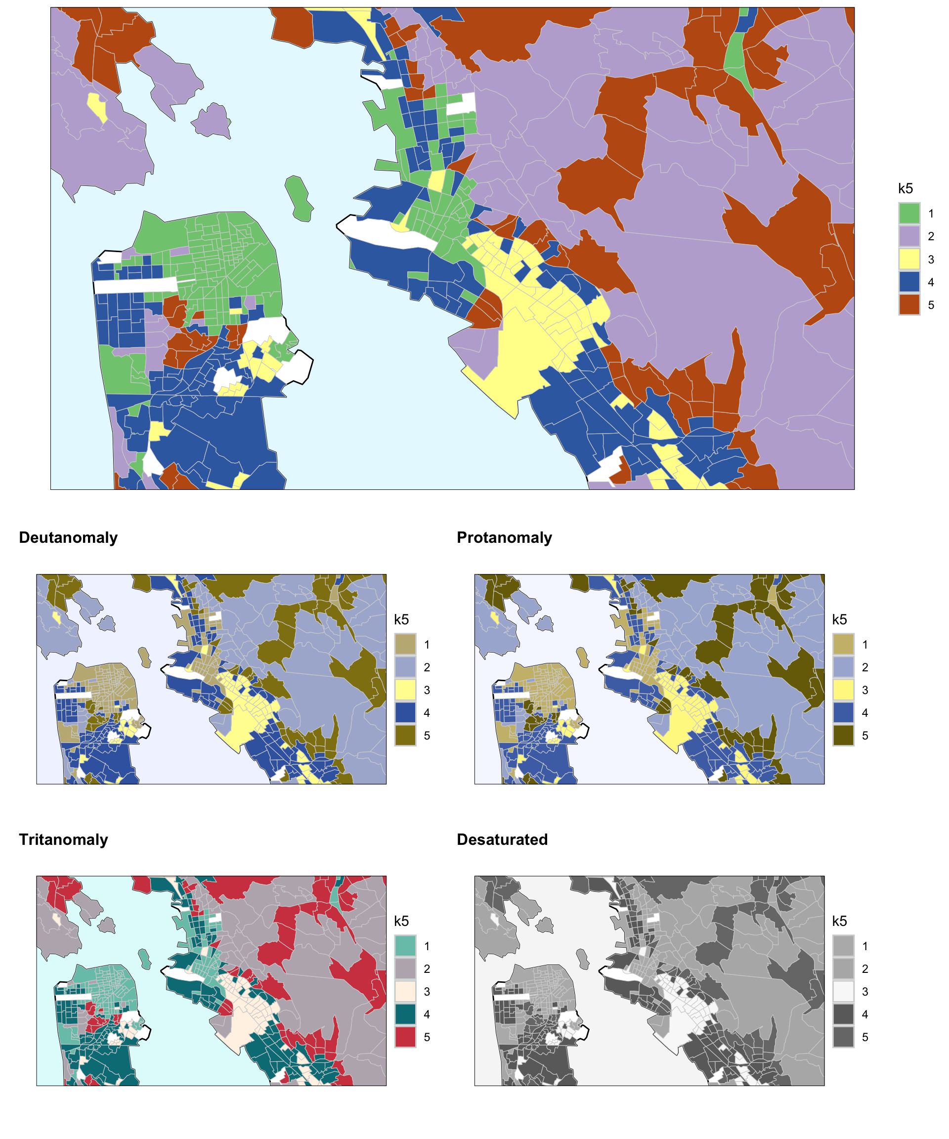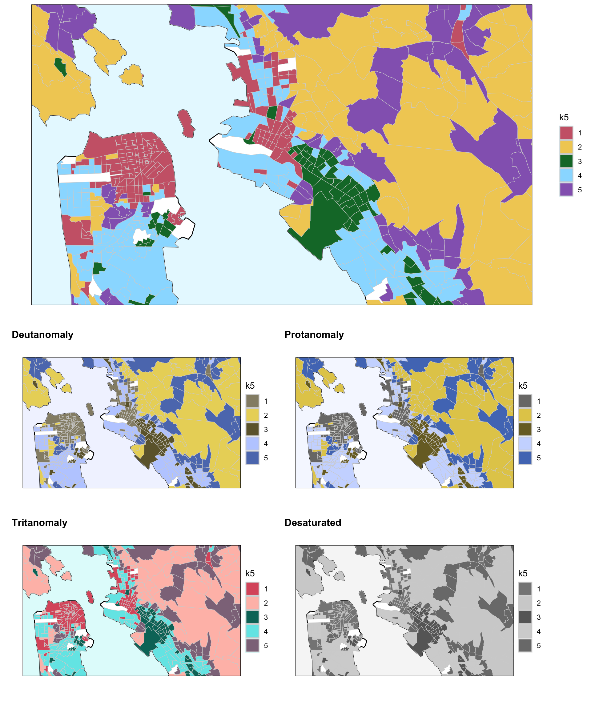 Ten classes seems to be at about the limit of what can be reliably mapped using categorical colour schemes. The CVD simulations in Figure 11 clearly show that some of the colours in those palettes are very close to one another. It may make sense in a case like this to consider which colours from the palette might be best mapped to which clusters. This requires close analysis of which clusters most often neighbour one another, something I explore in outline a bit further on.