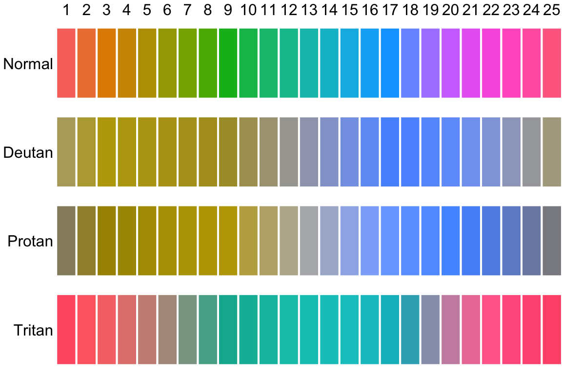 c("Normal", "Deuteranopia", "Protanopia", "Tritanopia", "Achromatopsia"),
