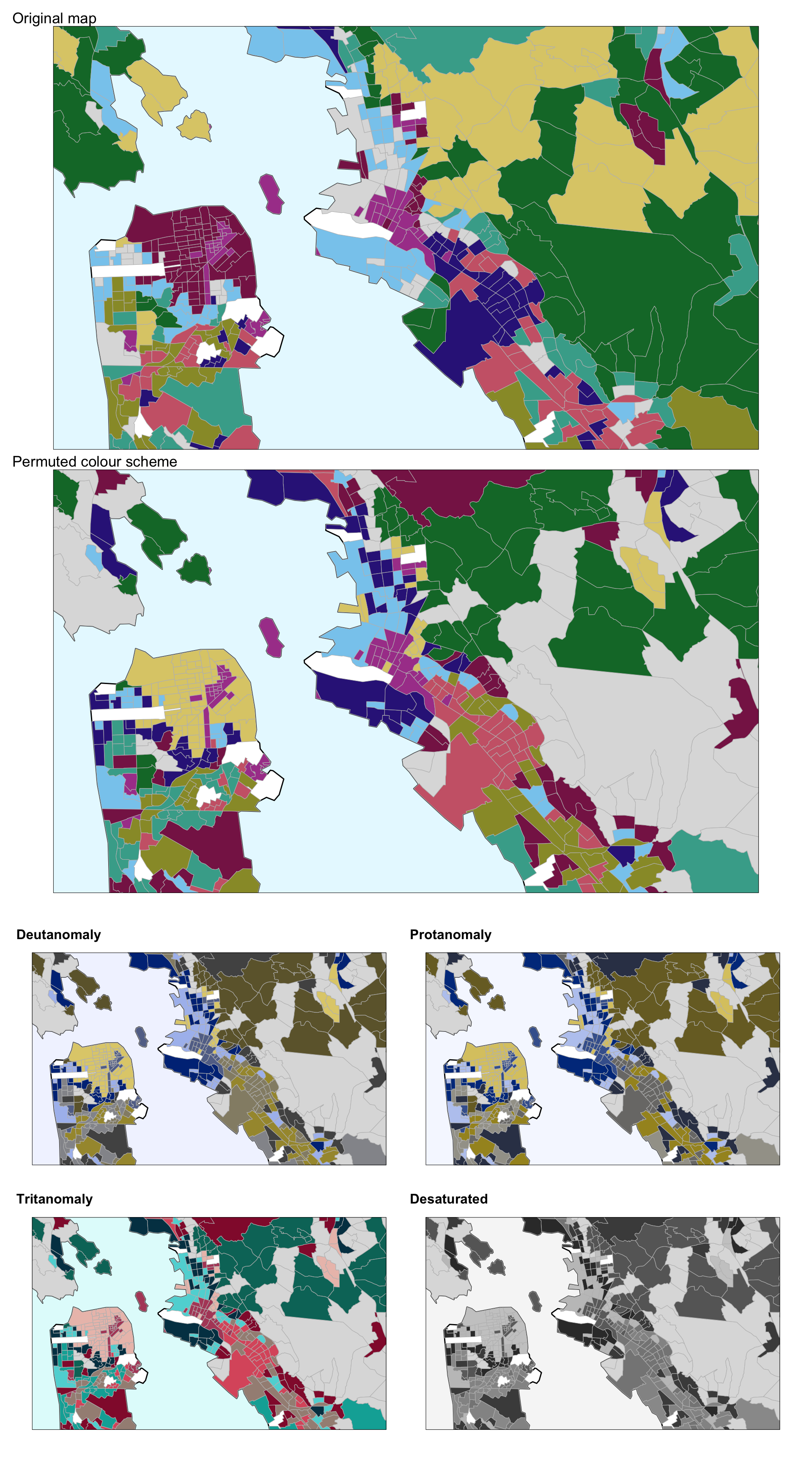 One area where the example shown seems like an improvement is in downtown San Francisco where two very similar colours were juxtaposed in the original map, and are not in the permuted colour scheme map, although it’s highly likely that there are other map areas where the comparison is less favourable.