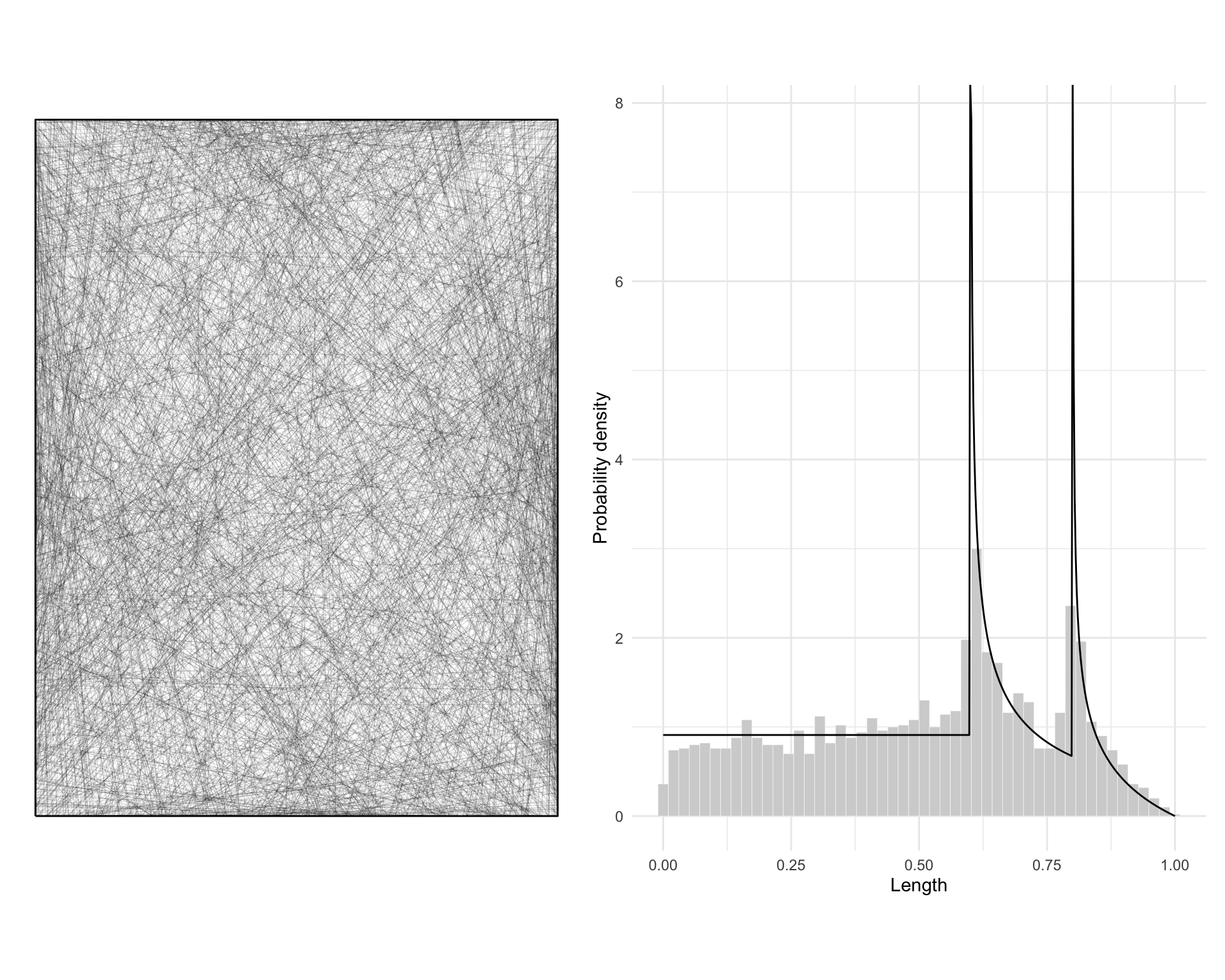 OK… welcome back. In this post, I am moving on to Chapter 4 Maps as outcomes of processes. I’ll get to point patterns in later posts, but first I want to jump straight to recreating Figure 4.6 which shows the theoretical and empirical probability density functions for the lengths of lines across a rectangular space. Mostly I’m jumping ahead to this topic because it was more interesting to code than point processes, which are so ably handled by built-in functions in spatstat.