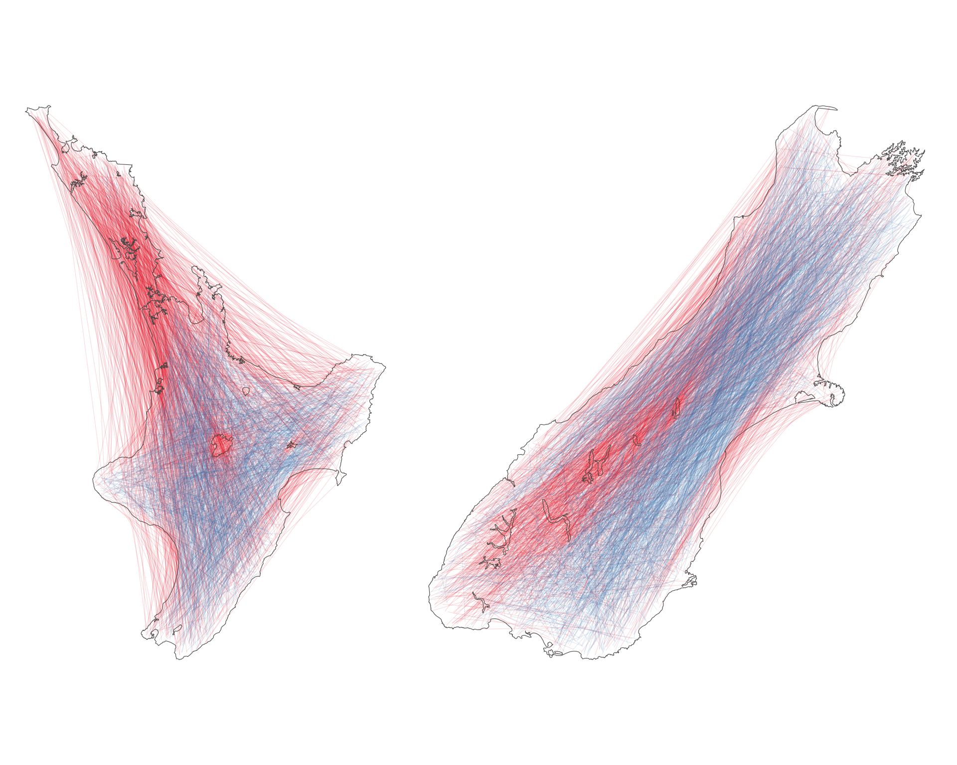 g5 | g6In effect the North Island is a lot less convex than the South Island and most of the longest potential lines between its farthest flung points are not wholly contained within the island. The South Island is roughly rectangular, and its longest ‘diagonals’ can be contained within the bounds of the island. That patch of red in the middle of the North Island is Lake Taupō which also stops a lot of the potential longest lines being fully contained within the island (if a line crosses a hole in the island, then it’s not considered as ‘contained’). Most of the blocked long lines in the South Island are also blocked by lakes in this way.